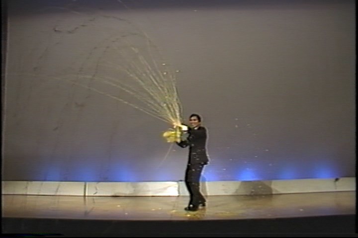 ラーメンを食べる。 (黄色の投げテープを投げ上げ、テープを、どんぶりの中に入れ水をかけ入れ、ラーメンを食べます)