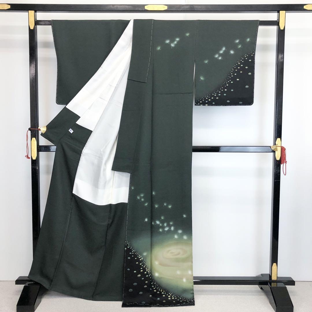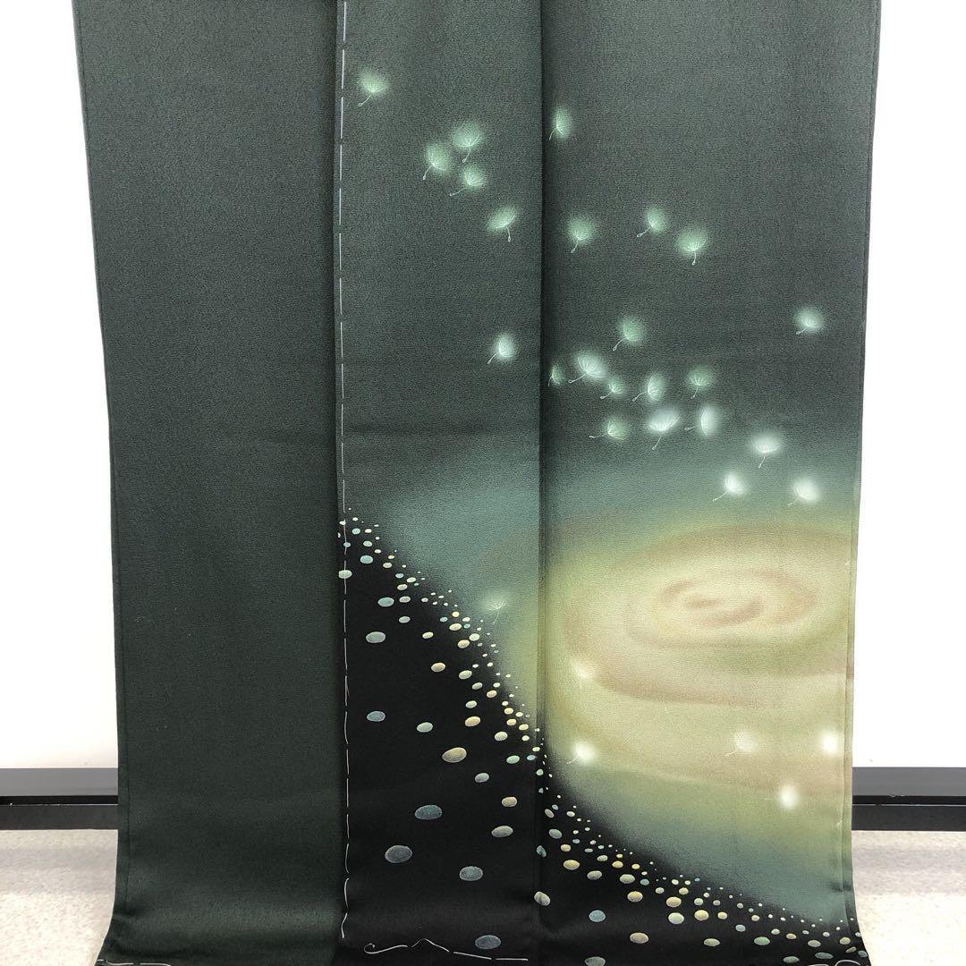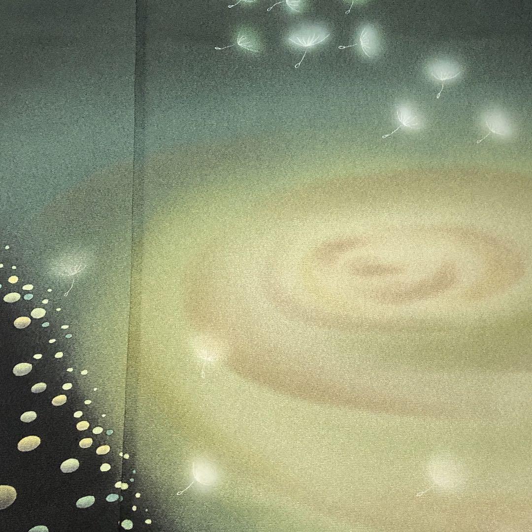錆鉄色の手触りの良い縮緬に宇宙のような渦模様に水玉、綿毛がデザインされたなんとも幻想的で美しい素敵な柄裄のお品でございます。