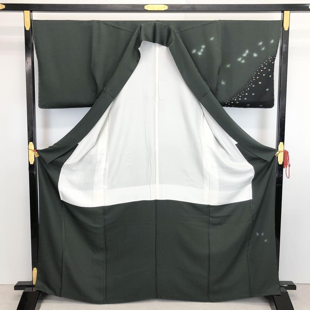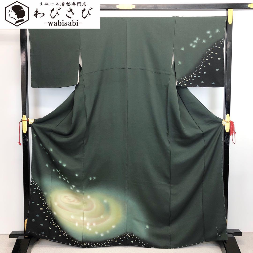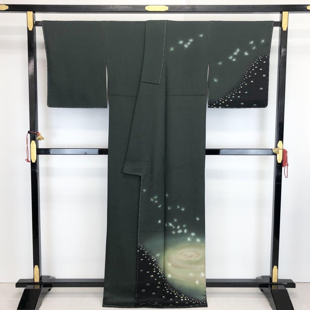 錆鉄色の手触りの良い縮緬に宇宙のような渦模様に水玉、綿毛がデザインされたなんとも幻想的で美しい素敵な柄裄のお品でございます。