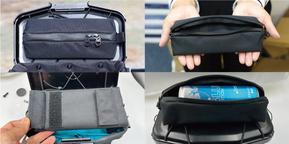 ベルクロ(マジックテープ)で脱着可能な小型ポーチが便利!ポーチの中も眼鏡や工具を固定するゴムが内蔵!