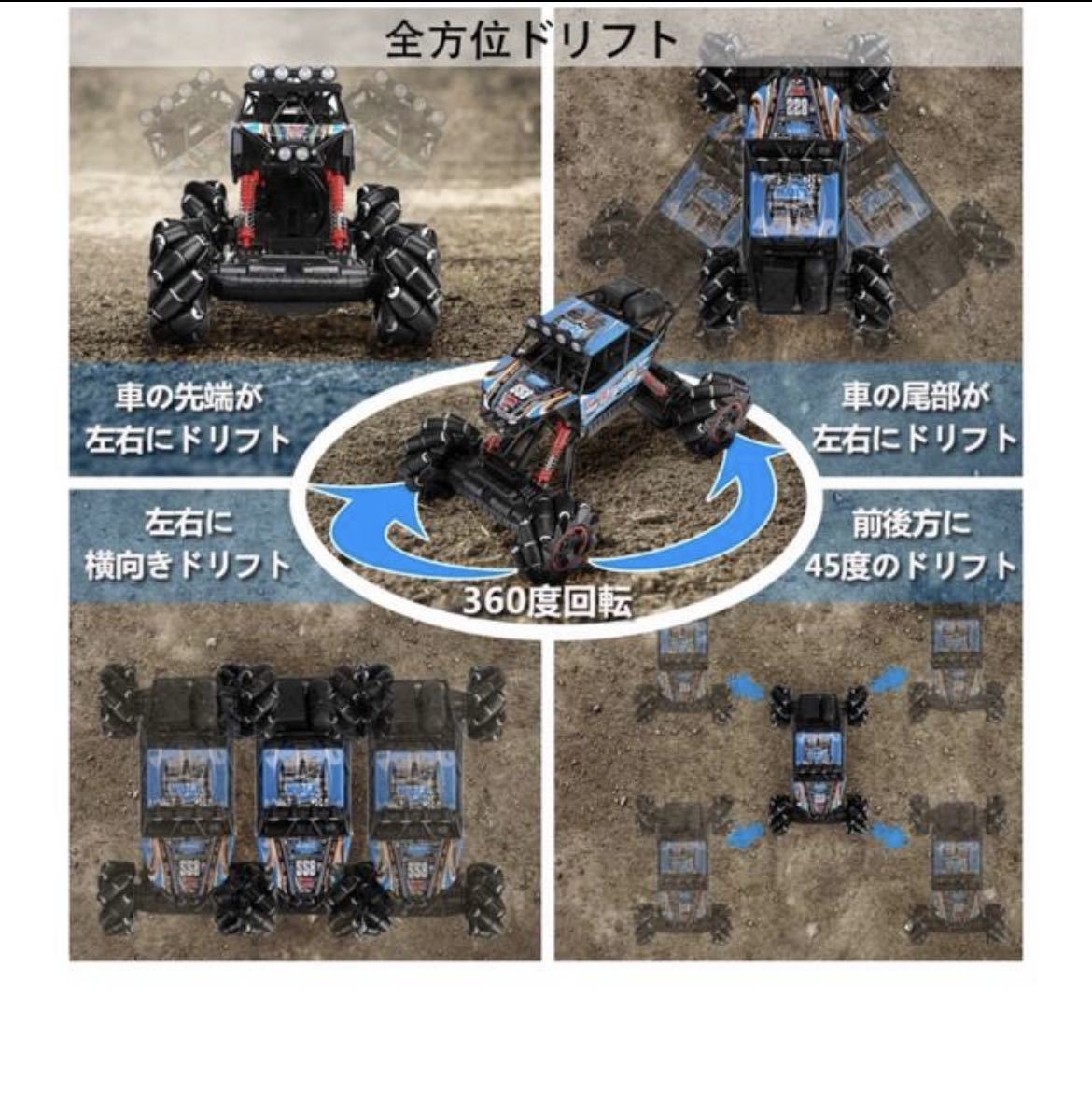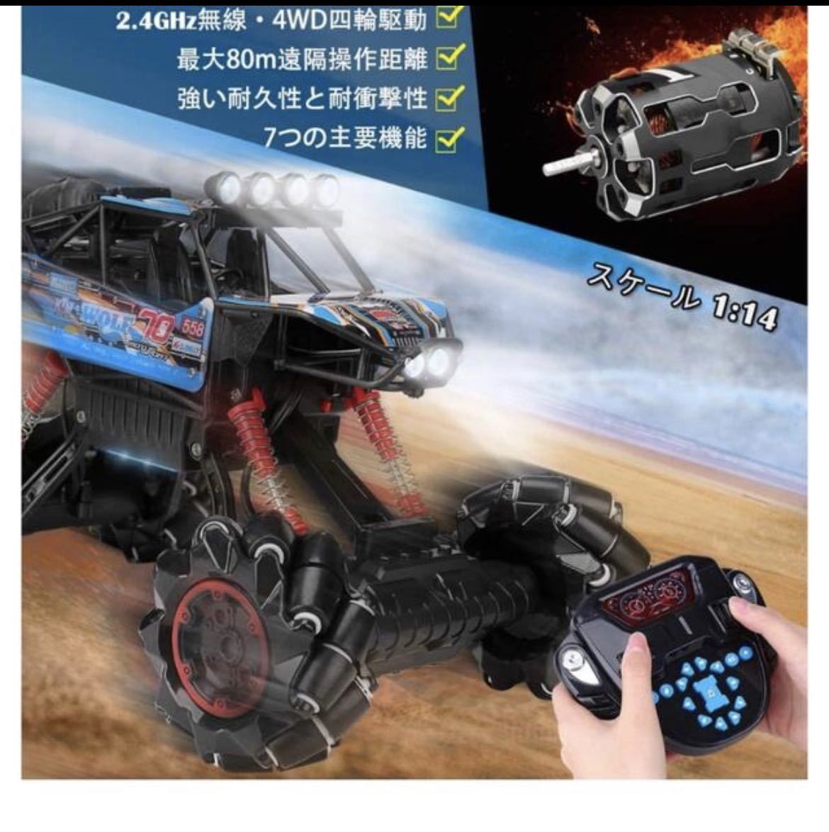 【オフロード性能抜群・全方位ドリフト】:1/14大きなサイズによりリアルで印象的です。このラジコンカーは四輪駆動を採用しており、あらゆる地形でも容易に安定した強力な動力トルクを提供することができます。体の向きを変更しないで全方位移動対応します。車の先端/尾部が左右、45度で左右の前方、45度で左右の後方と左右向きであらゆる方向にドリフトできます。