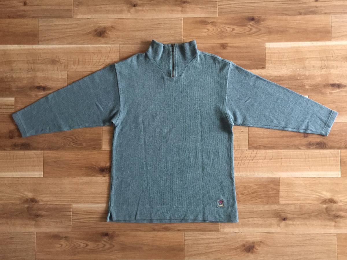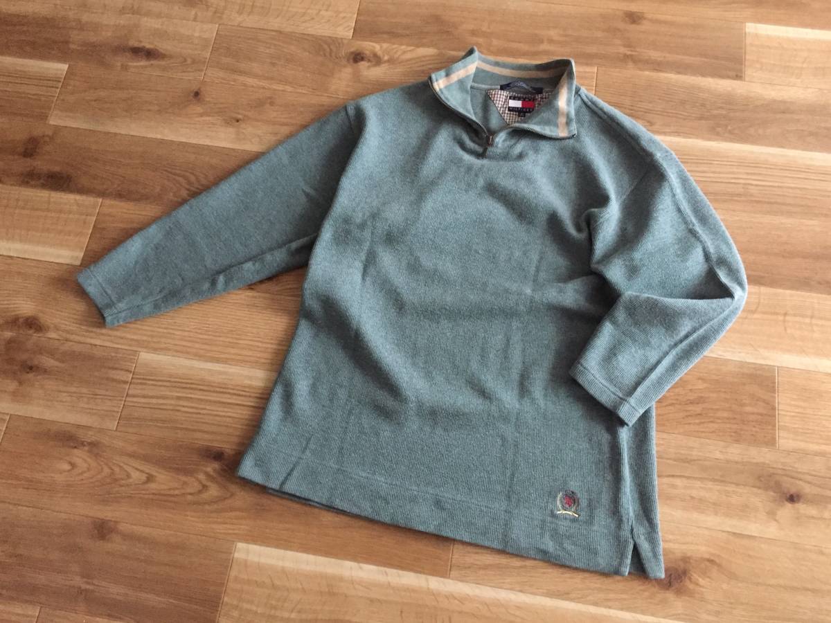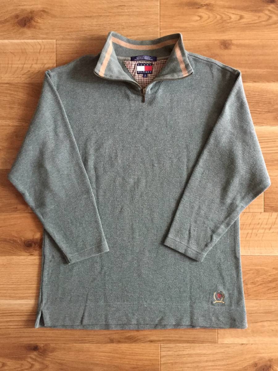 90's TOMMY HILFIGER トミー ヒルフィガー セーター 100%コットン ニット ハーフジップ Mサイズ グレーグリーンカラー ミリタリー風