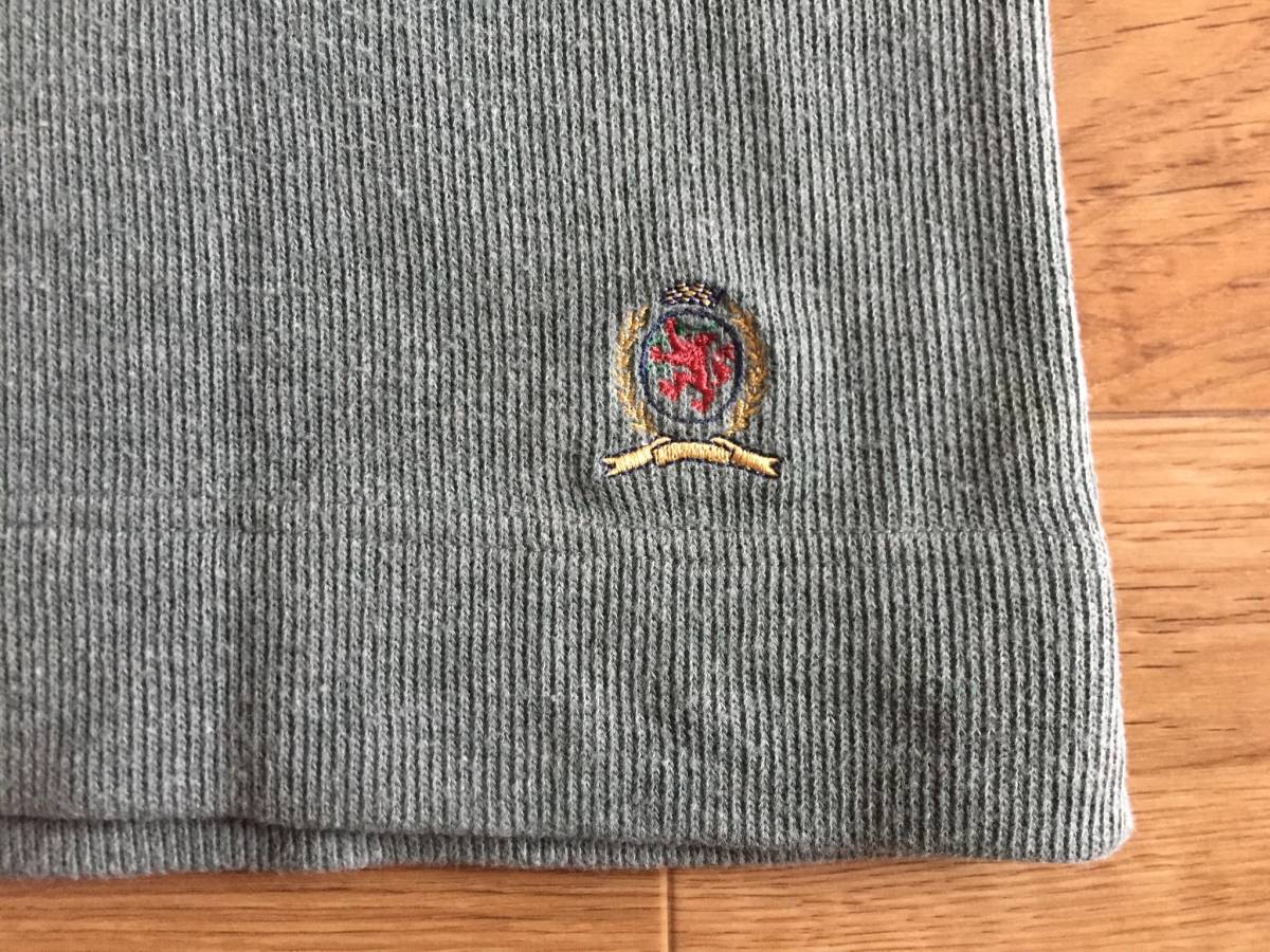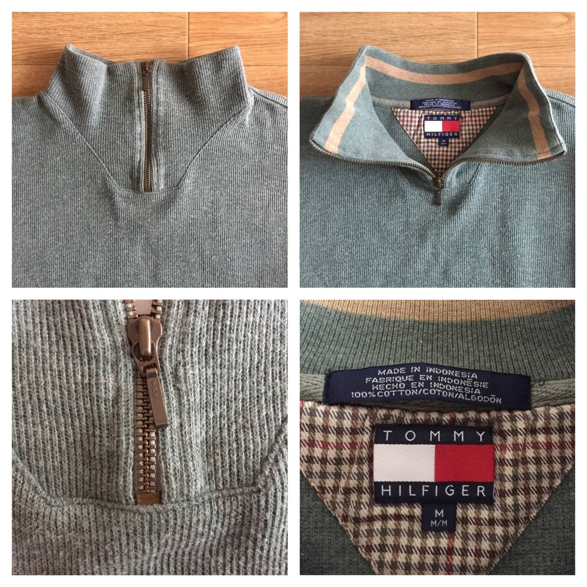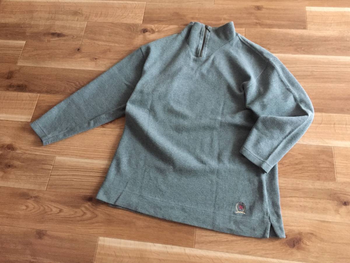 90's TOMMY HILFIGER トミー ヒルフィガー セーター 100%コットン ニット ハーフジップ Mサイズ グレーグリーンカラー ミリタリー風