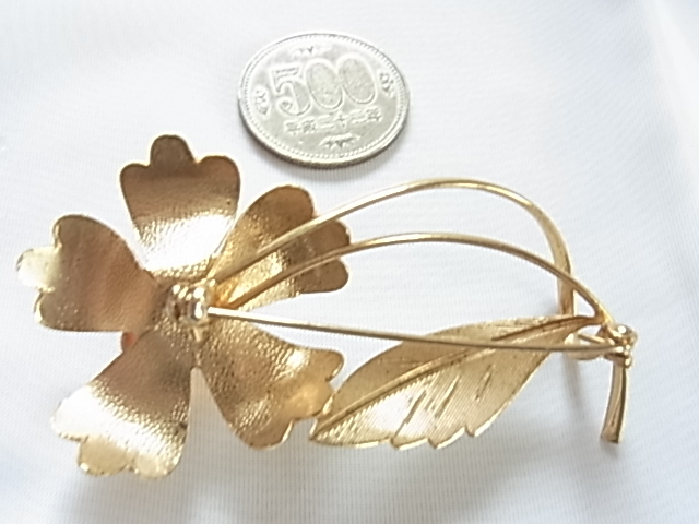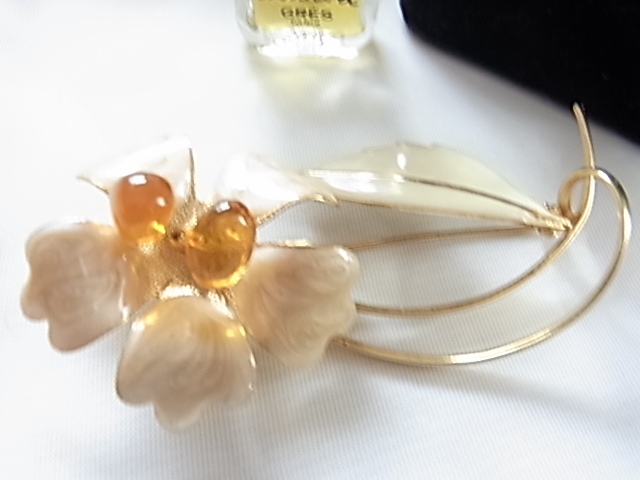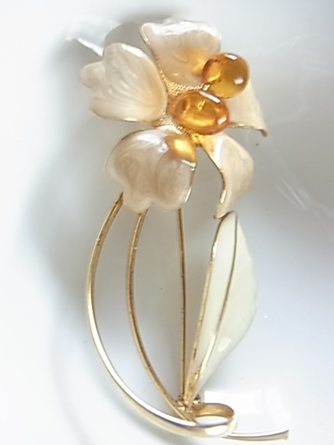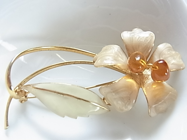 ビンテージ/ヴィンテージ 琥珀色のストーン2粒にシェル調のお花の花弁と葉っぱのモチーフ フラワーリーフ エネメル ブローチ▽