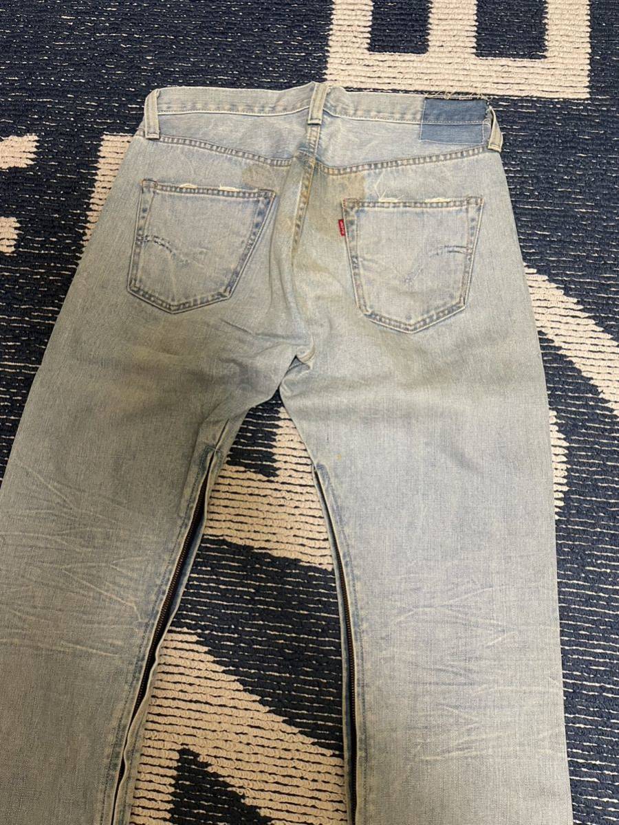 W36 ビンテージ加工、赤耳、チェーンステッチ、内モモ側zipアップ加工になります。