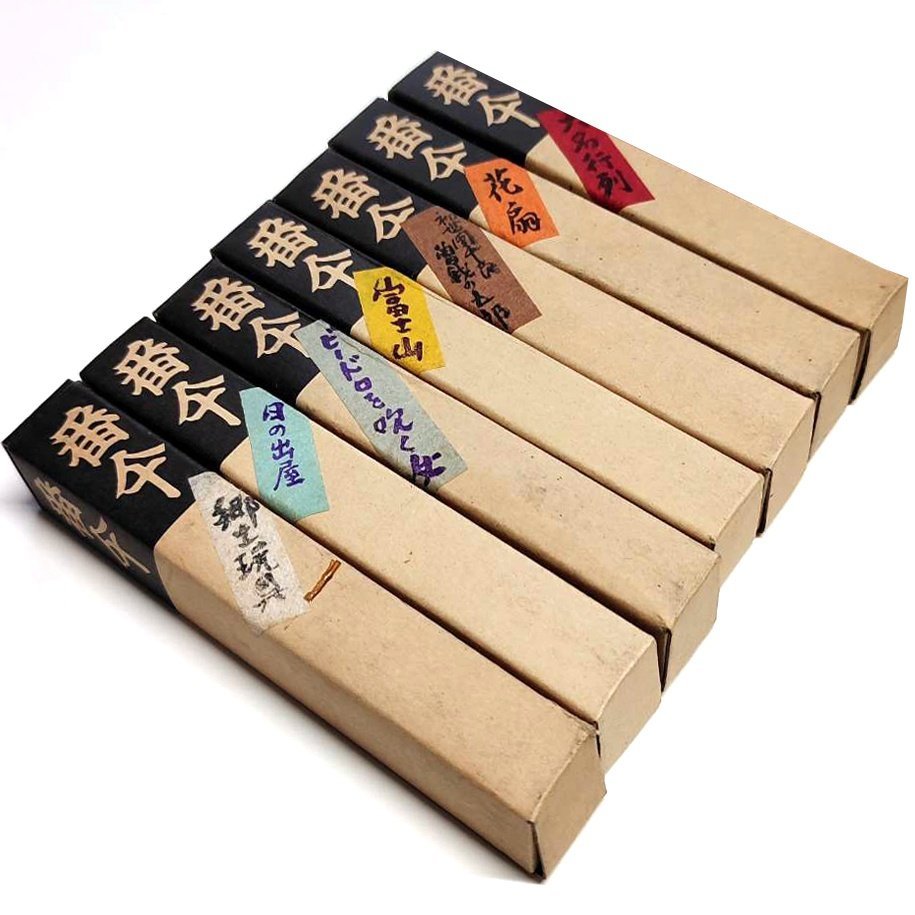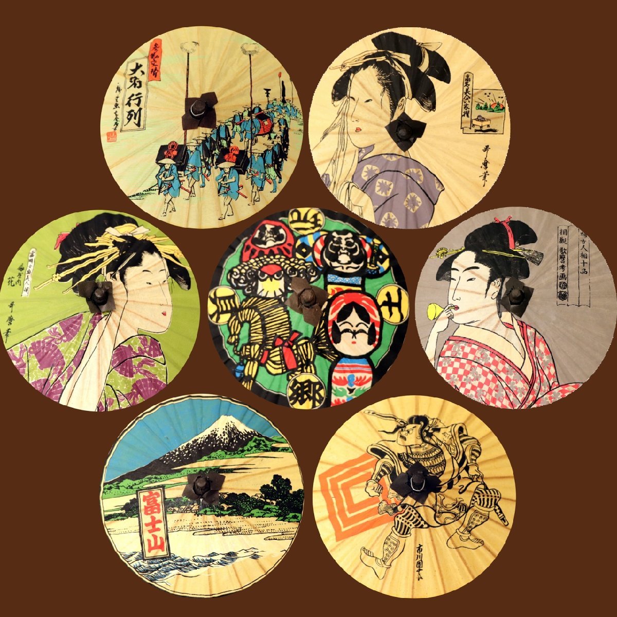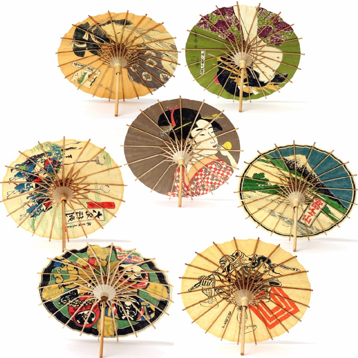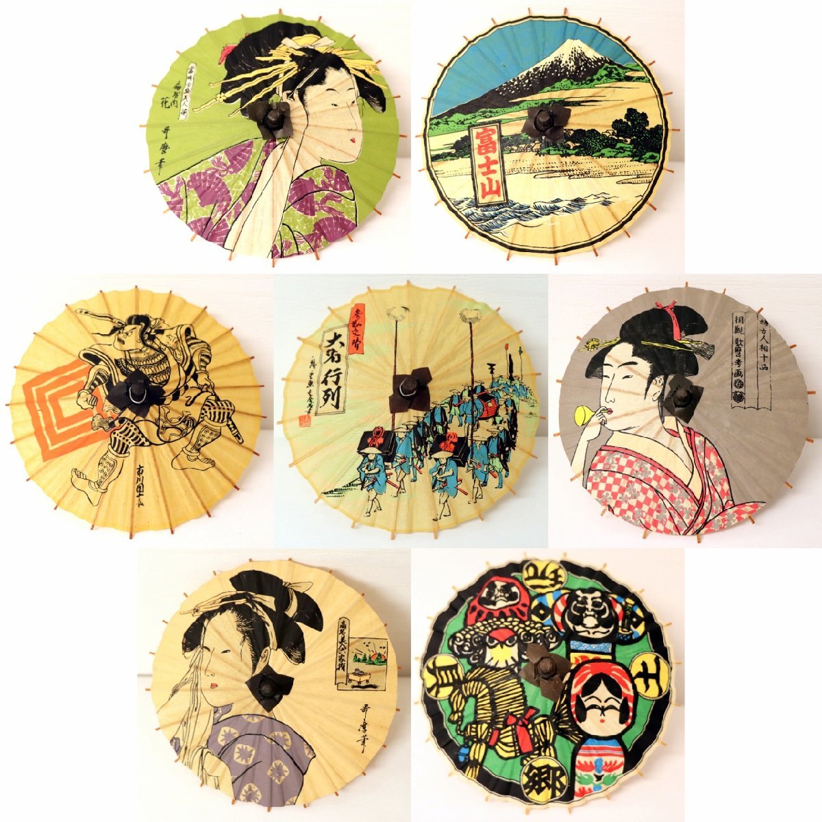 『郷土玩具』『日の出屋』『ビードロを吹く女』『富士山』『初世団十郎・曽我五郎』『花扇』『大名行列』計7種セット。傘直径:約145mm、長さ:115mm、江戸時代に人気があった版画や浮世絵がモチーフのミニ番傘です。壊れやすいためゆっくり開閉してください。状態ランク:C 複数セットありますが古い工芸品のため状態がそれぞれ異なります。そのため画像と全く同じとは限りません。予めご了承ください。