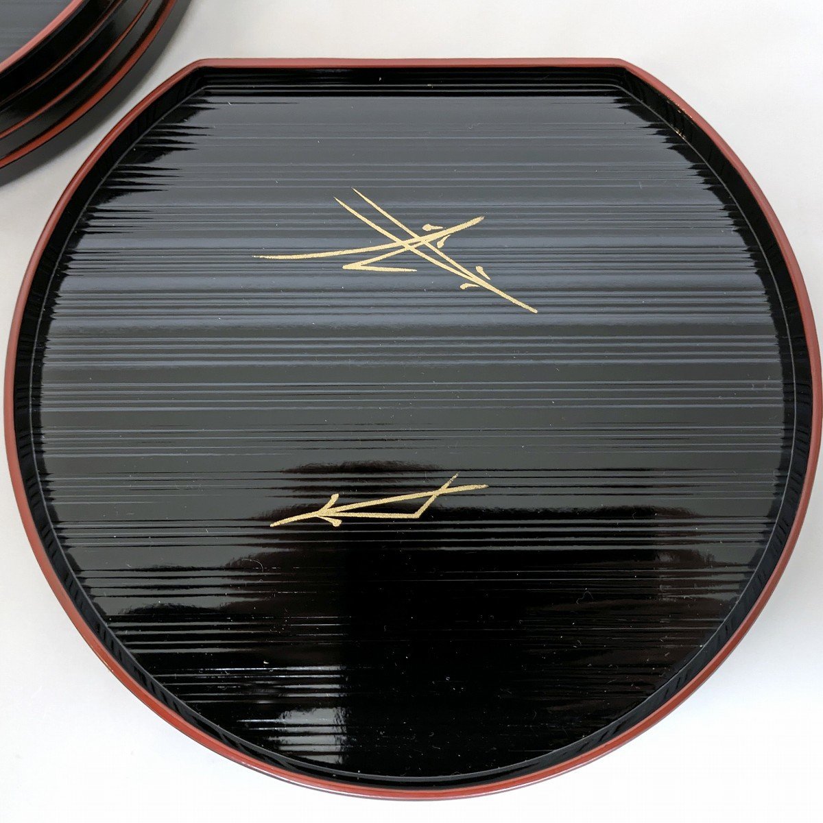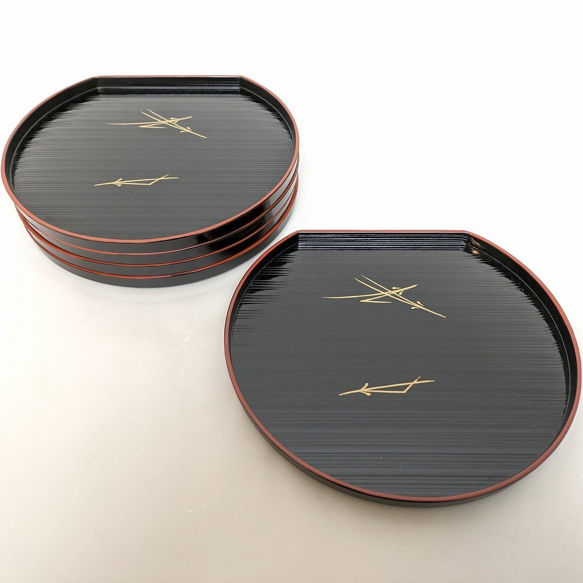 汁椀(直径:約95㎜、蓋抜き高さ:約70㎜)×5客、半月盆(幅:約205㎜、奥行:約185㎜、高さ:約15㎜)×5枚、状態ランク:C 使用による小キズ、ヨゴレが見受けられます。商品は画像に写っているものが全てです。その他状態は画像をご確認ください。