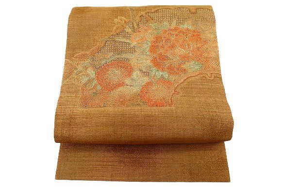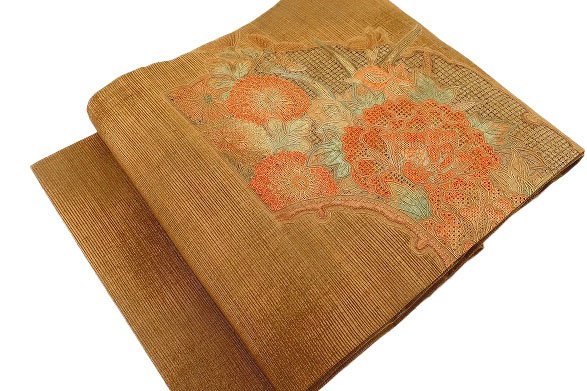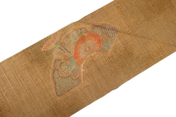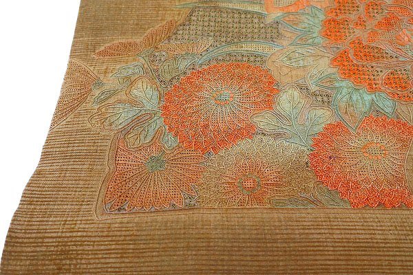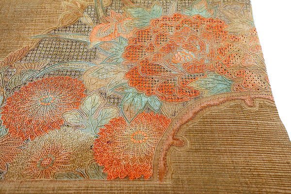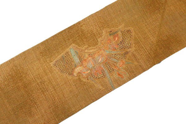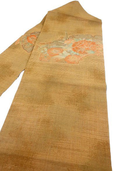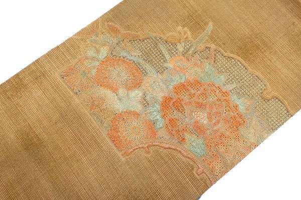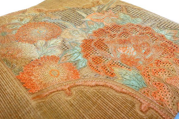 黄土色の絹地に、スワトウ刺繍で花文が織り込まれた名古屋帯です。
