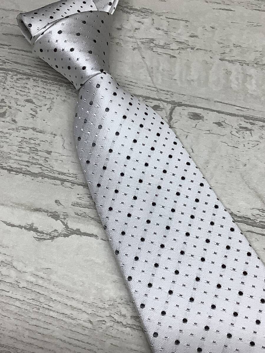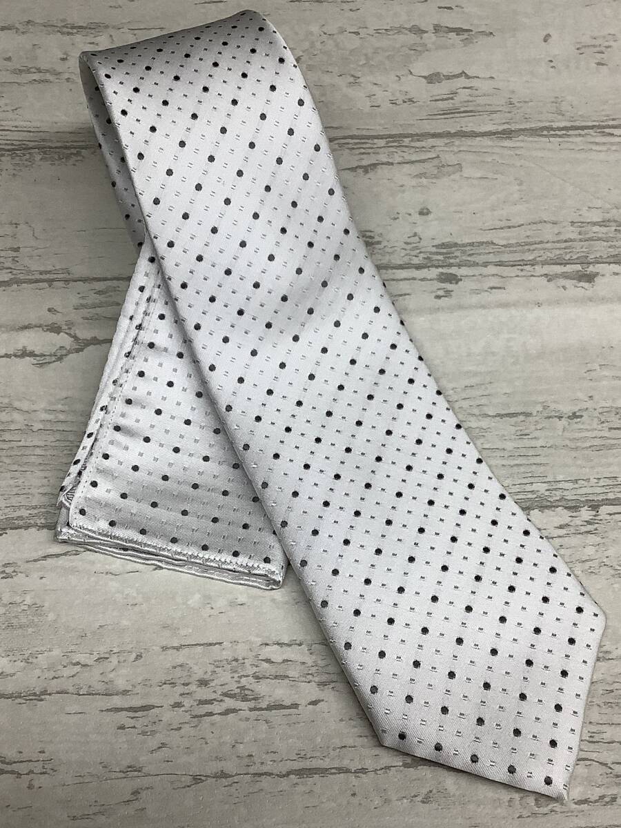 新品 日本製ロングサイズ シルバータイ 礼装ネクタイ シルク100%フォーマルタイ シルバー 白 ポケットチーフ付き ドット柄