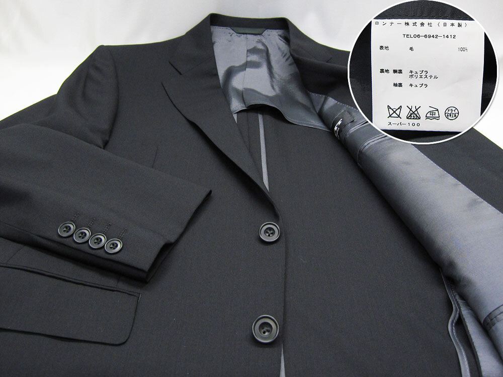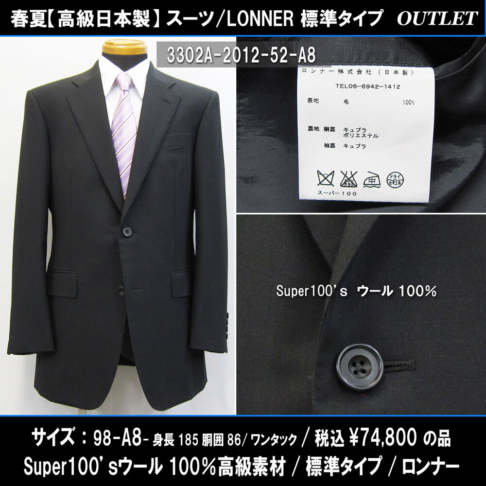 | 品名 | 3302春夏【高級日本製】ロンナースーツA8(T185W86)黒ブラック無地/Super100ウール生地/標準タイプ/74800円/LONNERアウトレット |