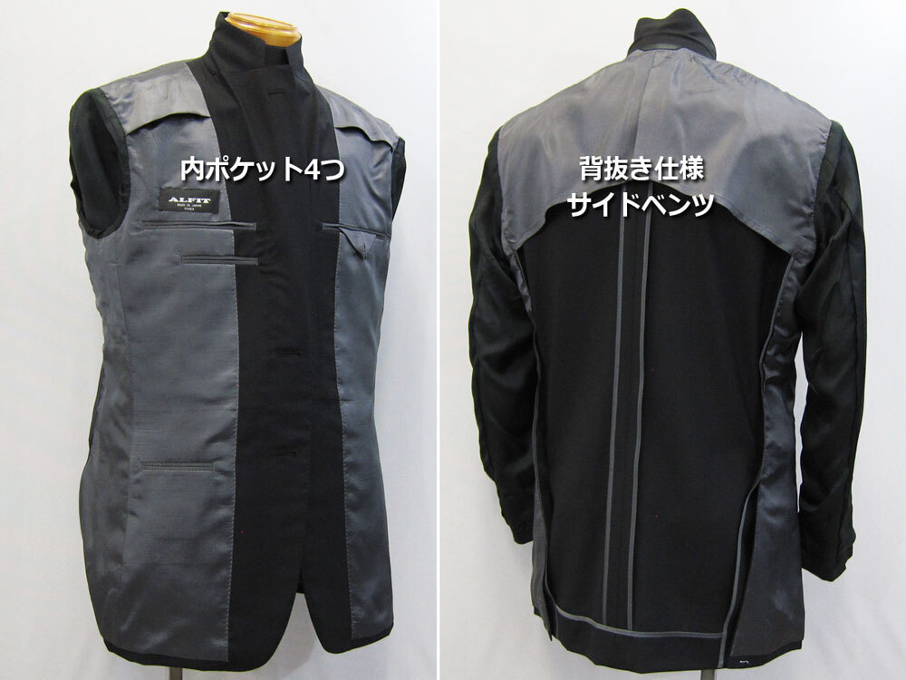 | ディテール | ★上着/シングル2釦・フラップポケット・サイドベンツ・背抜き仕様・袖釦4つ・内ポケット4箇所 ★パンツ/ワンタック・膝裏付・腰裏に滑り止め付・股シック付 |