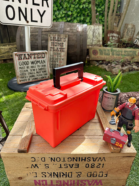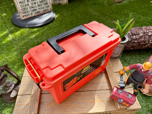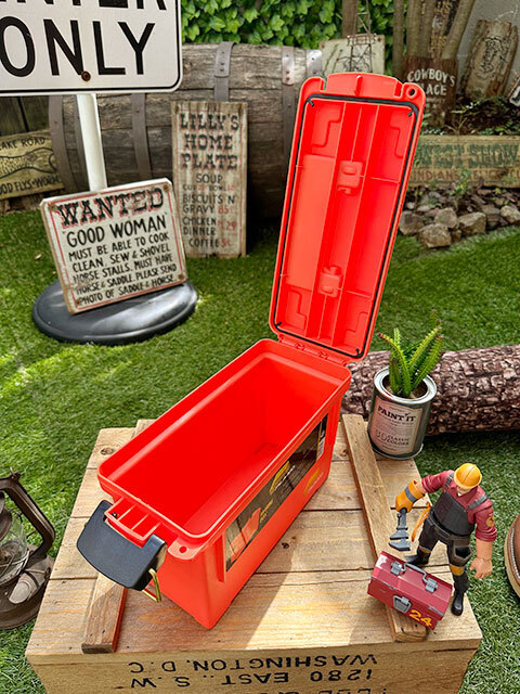 軍でマシンガンの弾丸を収納するのに使われるアンモボックスがモチーフになってて、それを小型の収納ボックスとして丈夫なプラスチックで仕上げたって製品です。
