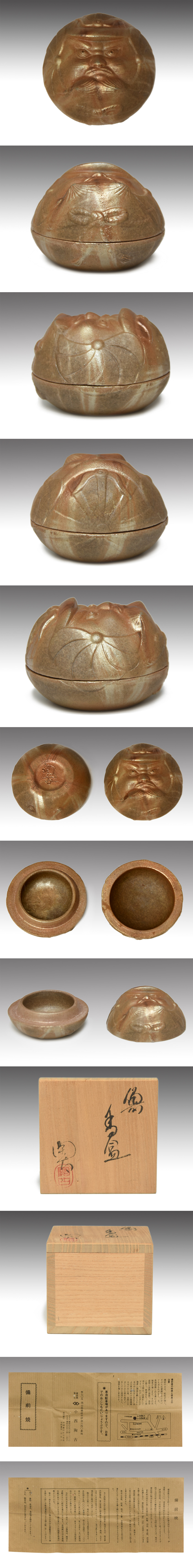 備前 小西陶古(造)武人香合です。 凛々しい兜を被った武人の姿が香合に表現されております。 目立ったキズダメージなく状態は良好です。 ※撮影の際に生じた写り込みなどがございます。 ご理解の程よろしくお願い致します。 |