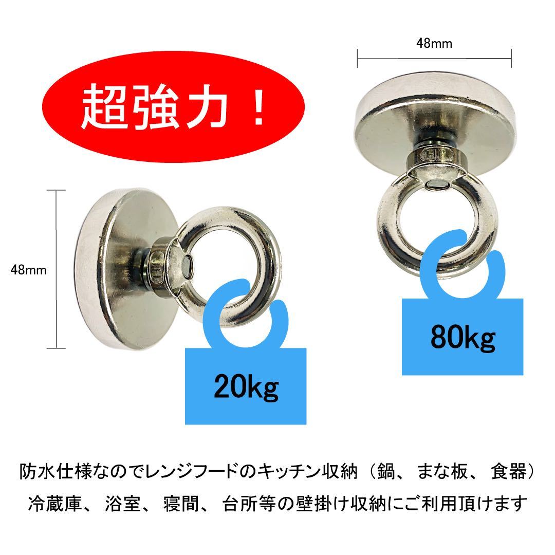 (A) 超強力 マグネットフック 磁石 48mm 耐荷重80kg ネオジム磁石 ステンレス マグネット フック 強力 磁力 防腐 防錆