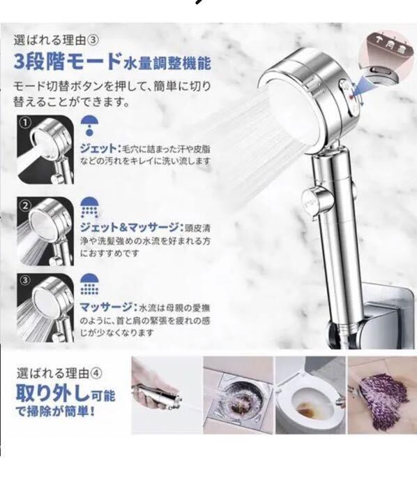 【3段階モード水量調整機能&水圧を自由に調節可能】3段階シャワーモード(ジェット/マッサージ/マッサージ&ジェット)は自由に切り替えることができ、家族みんながお好みのモードに切替ができて便利です。さらに、回転ボタンを回転して低水圧から高水圧までを調整でき、好みや用途にあわせて、ソフト水流とハード水流を選べます。