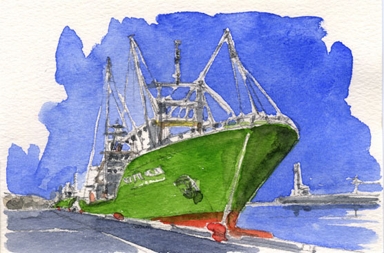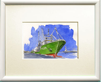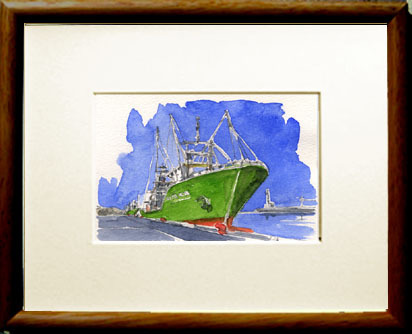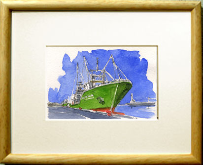 船舶---特に漁船も私が好んで描く対象です 日本は海洋国・漁業国ですから 海岸線沿いに旅行すれば 必ず小さな船溜まりがあり 漁船に出会えます この絵は数年前のものですが 小さな船溜まりではなく大規模な漁港で描いたものです 遠洋漁業船団の一隻でしょう 実に立派で雄々しい姿でした