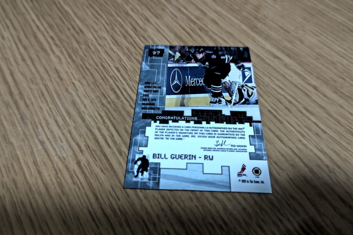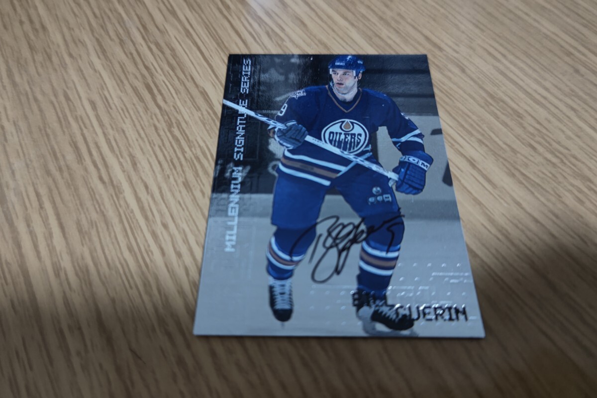 アメリカ4大スポーツのひとつナショナル・ホッケー・リーグNHLのエドモントン・オイラーズなどでライトウィングとして活躍、オールスター4回選出、セカンドオールスター(その年のNHLの12人のベストプレイヤー)に選出、また、アメリカ代表としてオリンピックに3度出場、アメリカ殿堂入りも果たした Bill Guerin 直筆サインカードです。カードはBe A Playerカードより出されたものです。