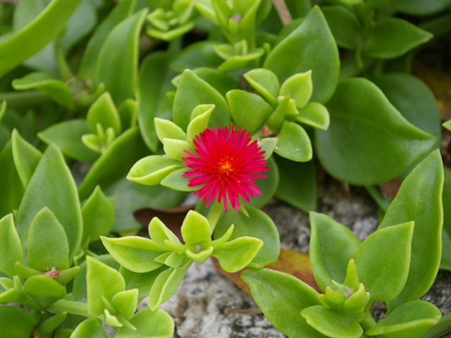 ハナツルソウは多肉性の多年草です。冬も枯れません。夏から秋にかけてマツバギクのような赤い花が咲きます。葉は肉厚で光沢があります。横に這って成長します。南アフリカ原産の植物です。繁殖力が旺盛で容易に広がります。