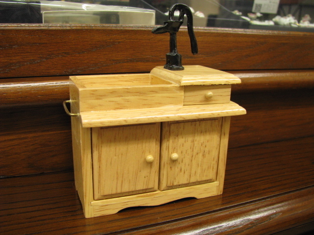 なんと!ポンプ式のシンクです。これでも、井戸から水を汲んできて炊事をするよりずっとマシなのでしょうね。本当に昔の人はすごいですよね。「ちょっと昔」のドールハウスを作りたい方、必見です!※シンクに排水用の穴は空いていません。※扉は開きます。右上の引き出しも引き出せます。サイズ:W95xD50xH115mm。