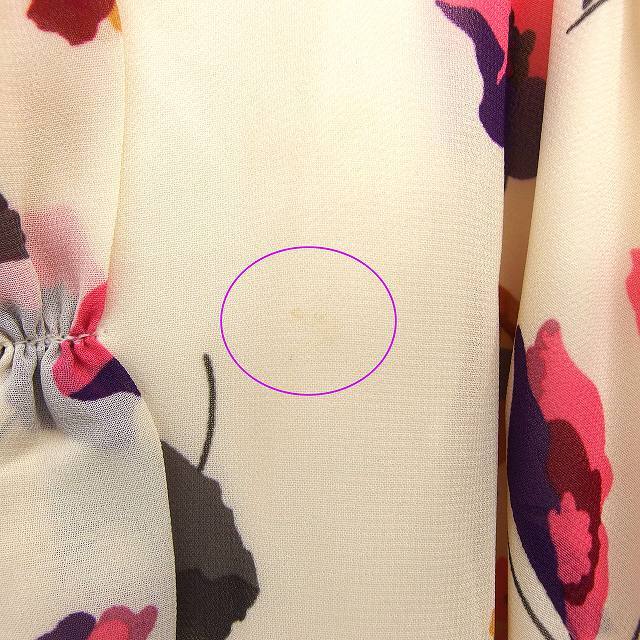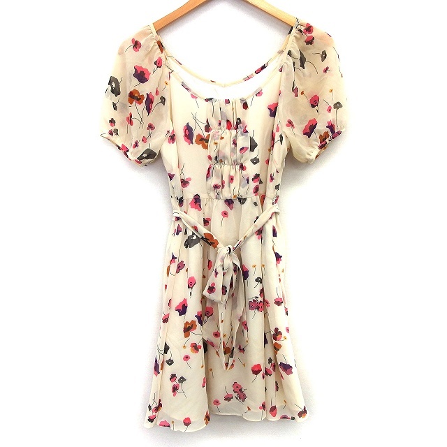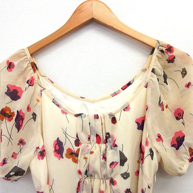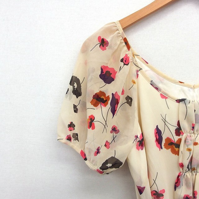 レッセパッセ LAISSE PASSE ワンピース チュニック フレア ミニ シフォン 花柄 タック リボン 半袖 丸首 36 ベージュ /HT27 レディース