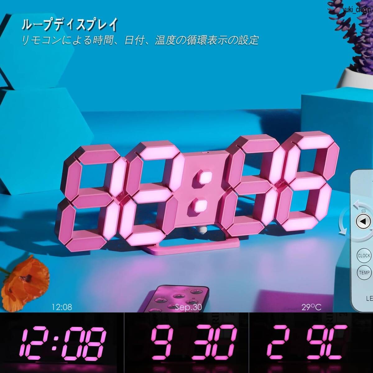デジタル時計 ネオン壁掛け時計 ピンク 9.7インチ LED時計 3D時計 置時計 明るさ調整可能 リモコン付き 日付 温度 アラーム機能