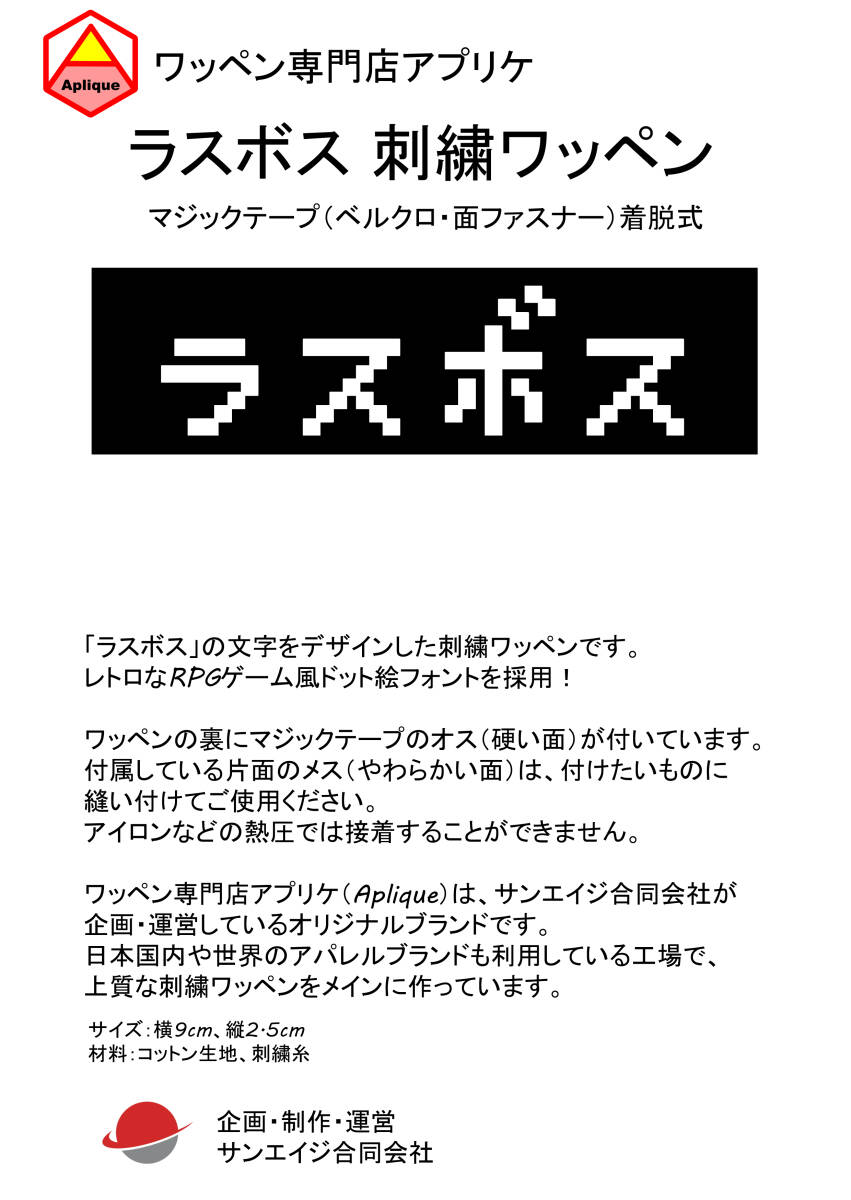「ラスボス」の文字をデザインした刺繍ワッペンです。