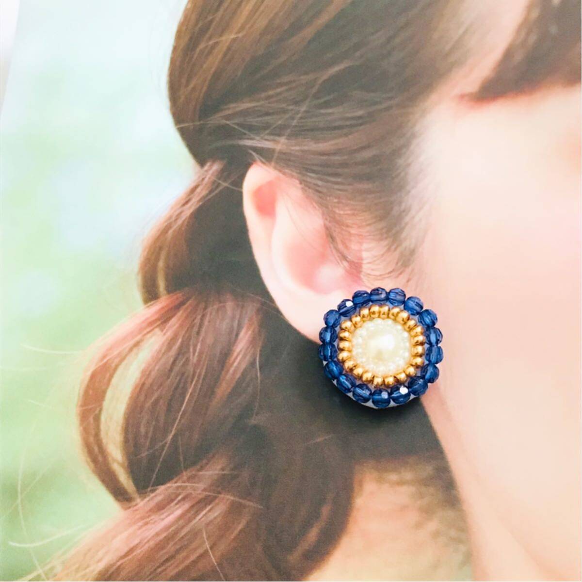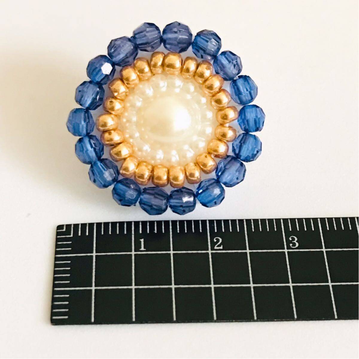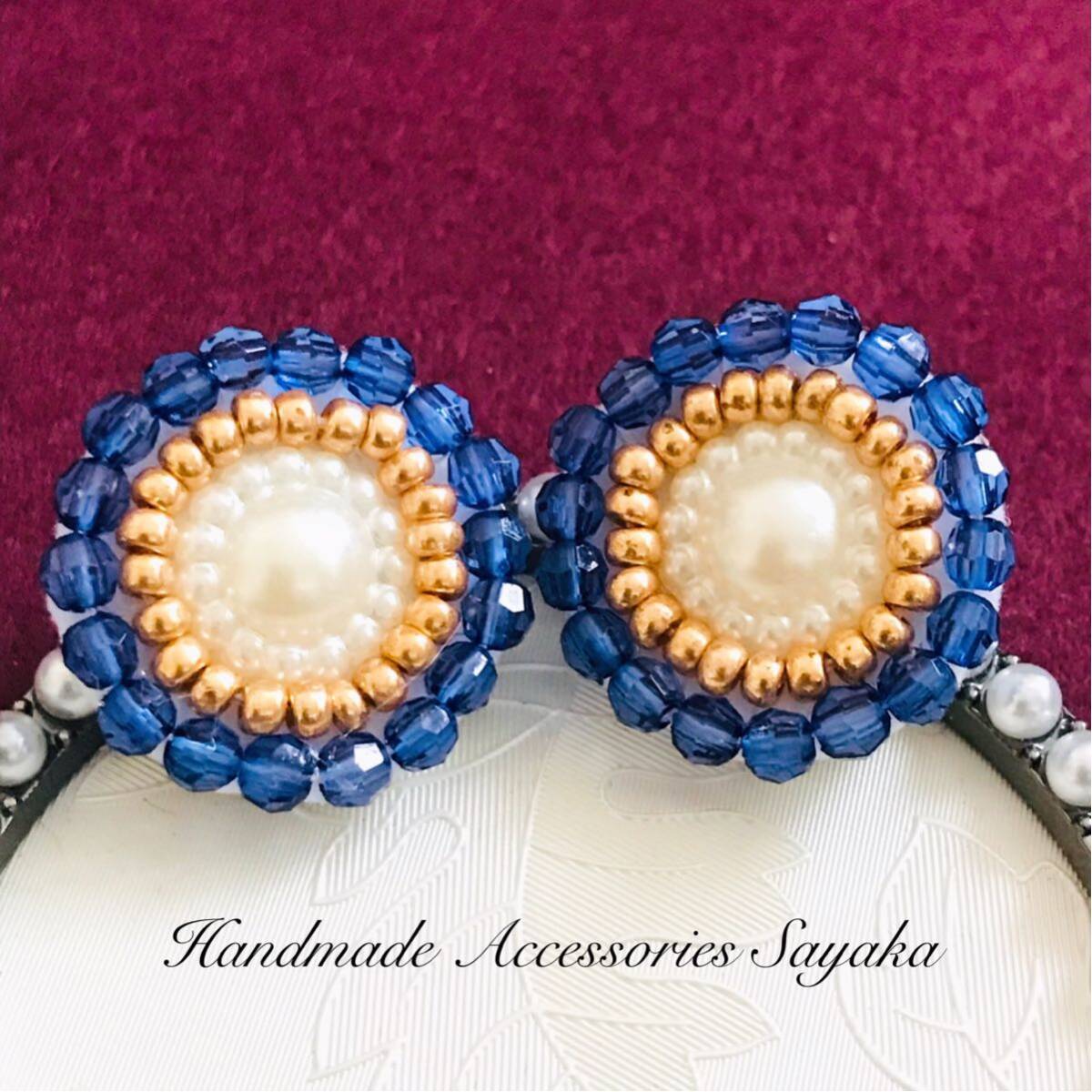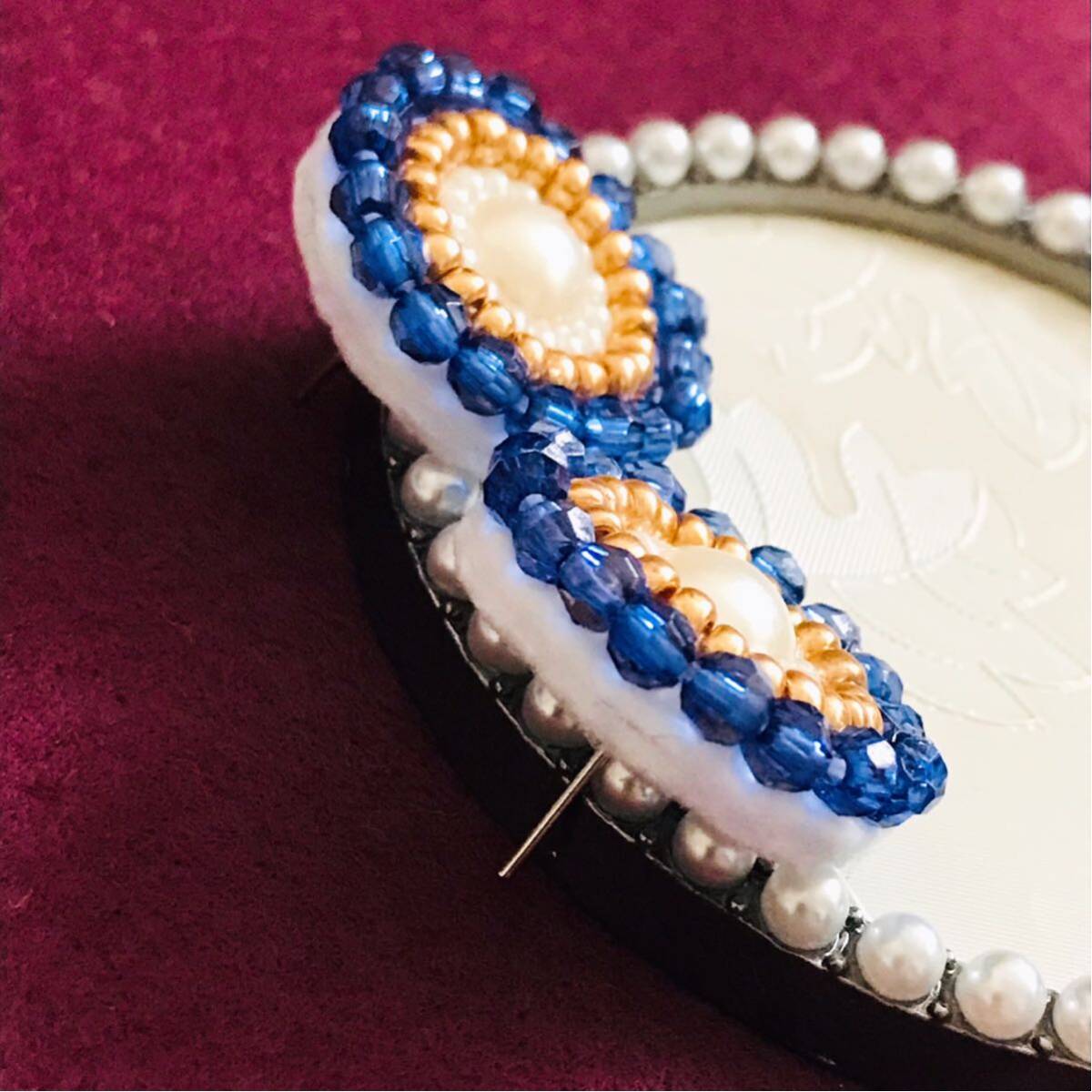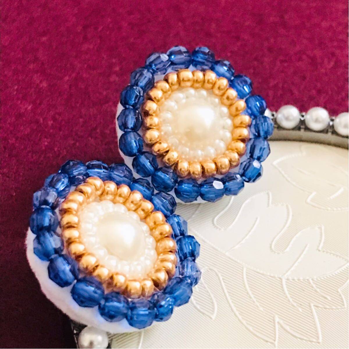 新品即決◆アンティーク調 ハンドメイドピアス ビーズ刺繍 耳飾り ブルー パール 手縫い アクセサリー 手作り 大ぶり 軽い