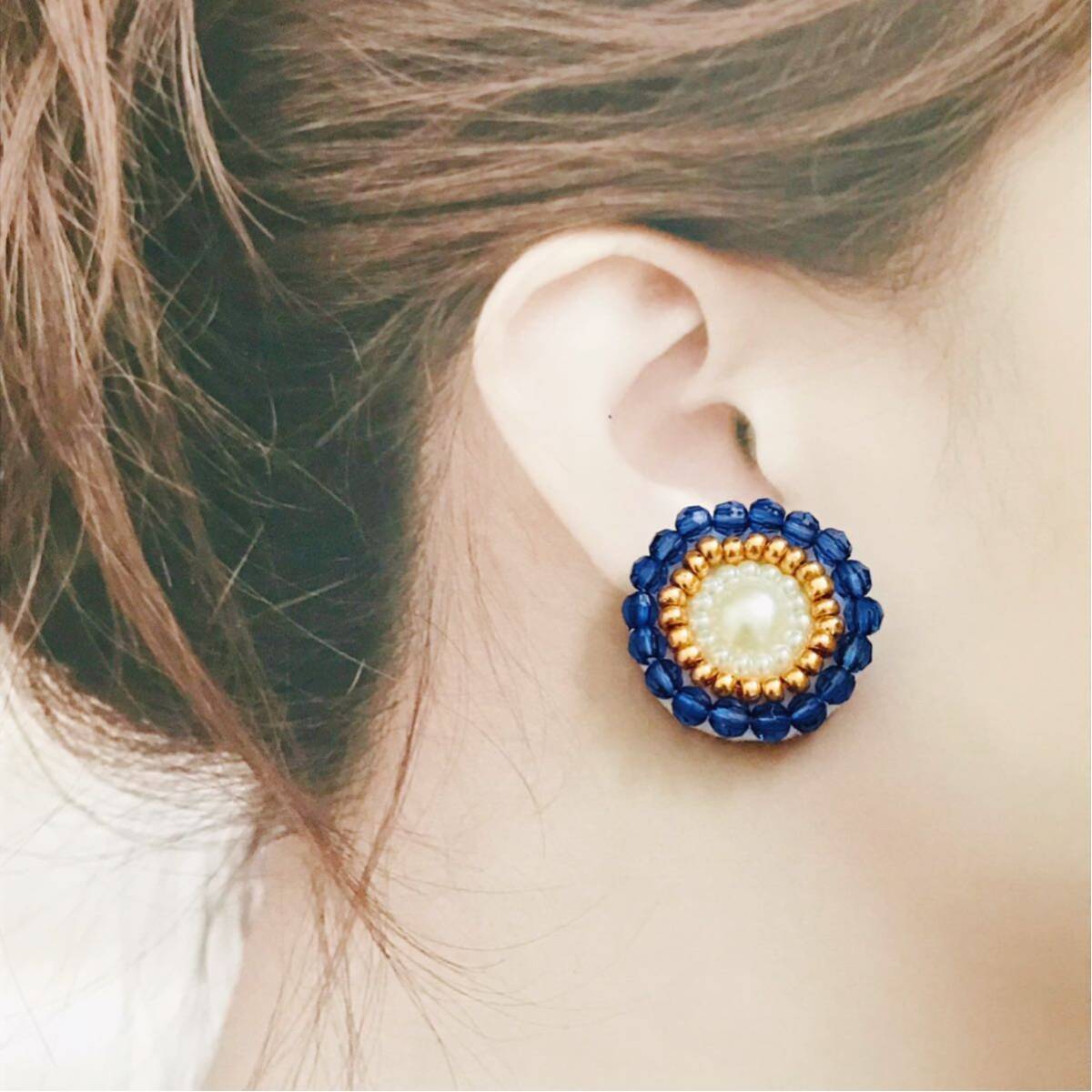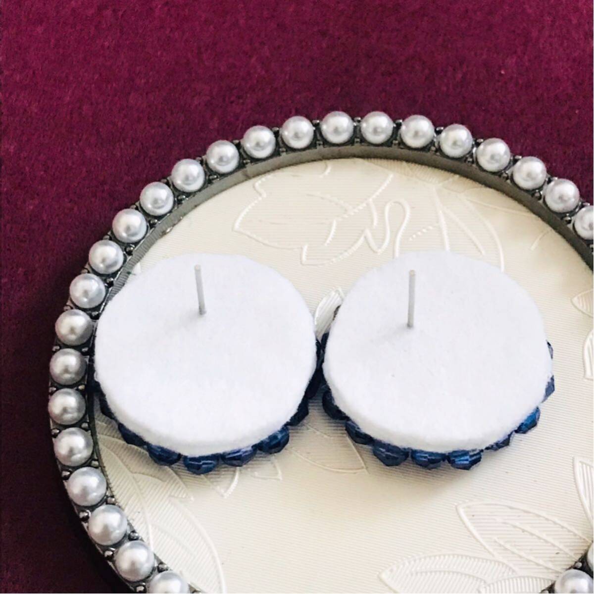 【商品説明】ハンドメイドのビーズ刺繍ピアスになります。軽くするためブルーのビーズはアクリルビーズを使用しております。落ち着いたブルーカラーです。こちらは、スタッドピアスで既に貼り付け、出来上がっているものですので、他への変更は一切不可になります。サイズなど1番最後の画像でお確かめの上宜しくお願い致します♪