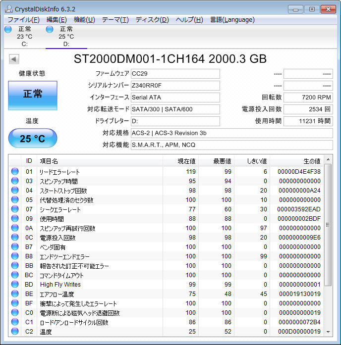 SATA600・64MBキャッシュ・7200回転で、静かで読み書きも速く、状態は良好のようです。