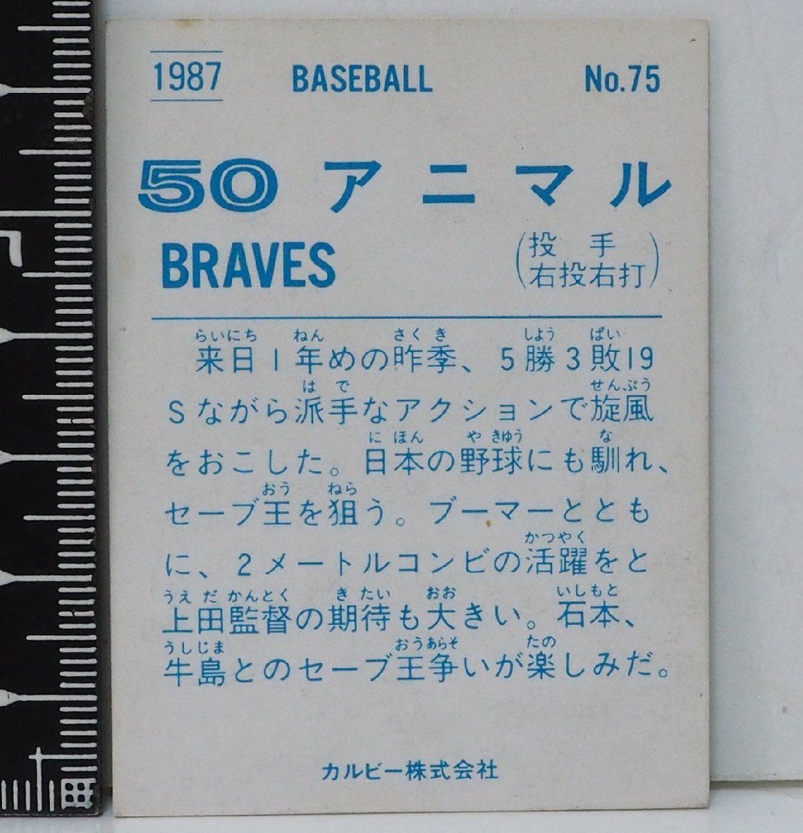 87年 カルビー プロ野球カード No.75【アニマル 投手 阪急ブレーブス】昭和62年 1987年 当時物 Calbee おまけ 食玩 BASEBALL【中古】送料込