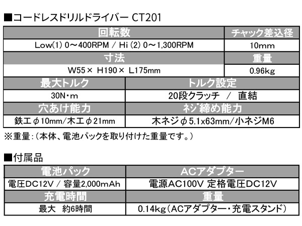 コンパクトツール 12Vコードレスドリルドライバー CT201 小型 軽量 充電式 20段クラッチ 電池パック2個付 送料無料