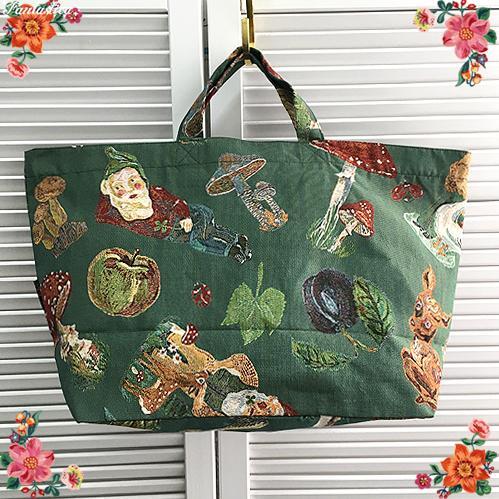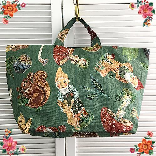こちらは、ドワーフやマッシュルーム、森の動物たちの姿がファブリックいっぱいに敷き詰められたプリティー・キッチュな一品。