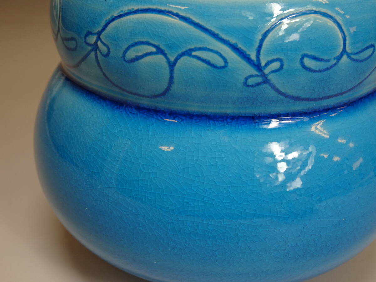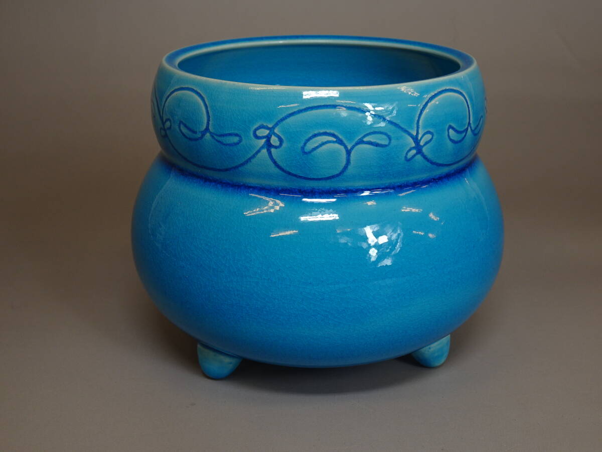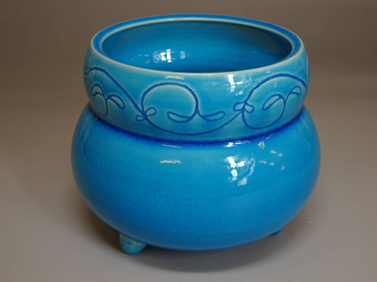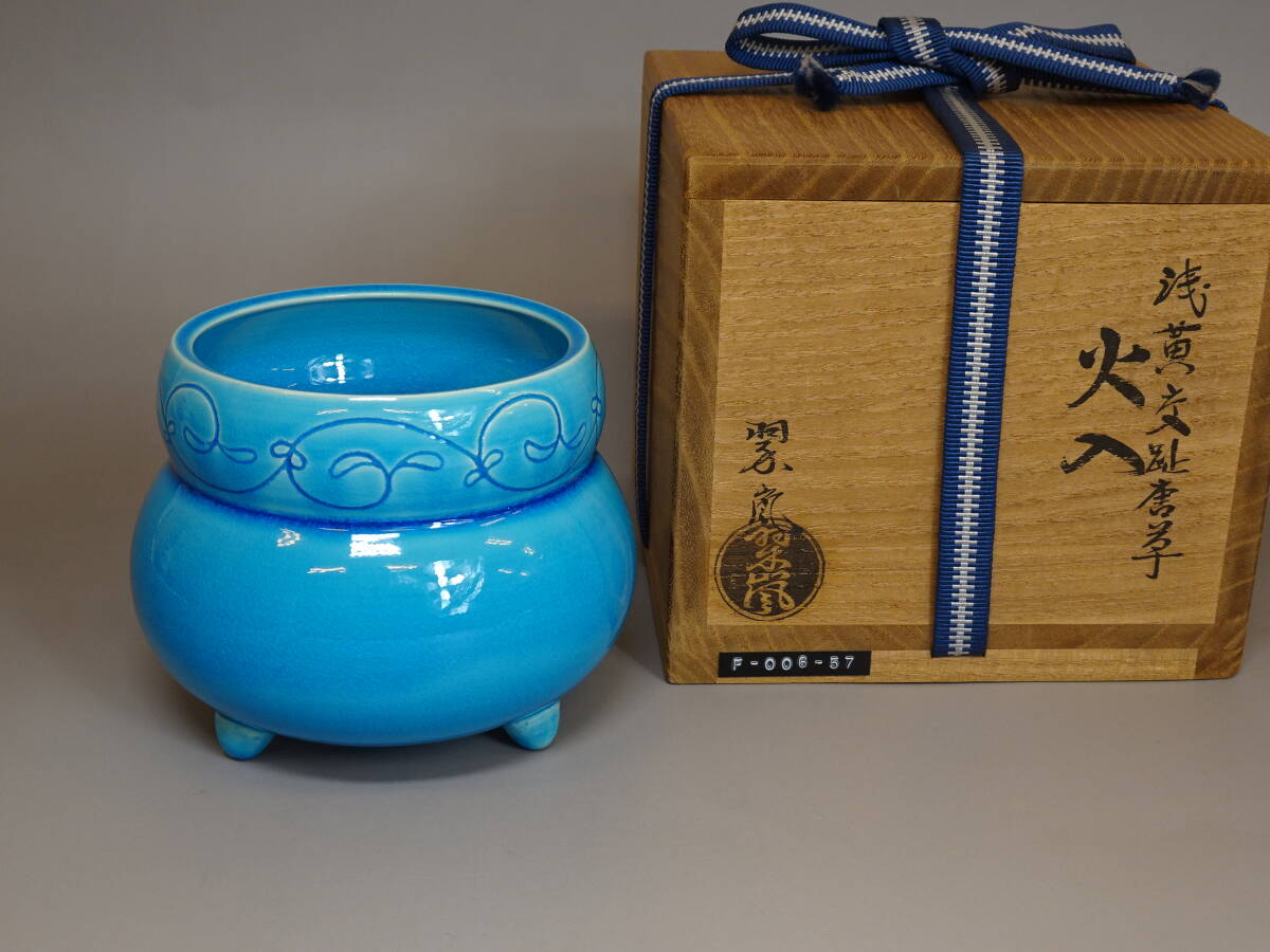 【涼風庵】中村翠嵐 作 浅黄交趾唐草火入 瓢形 三つ足 美品 茶道具 | |||