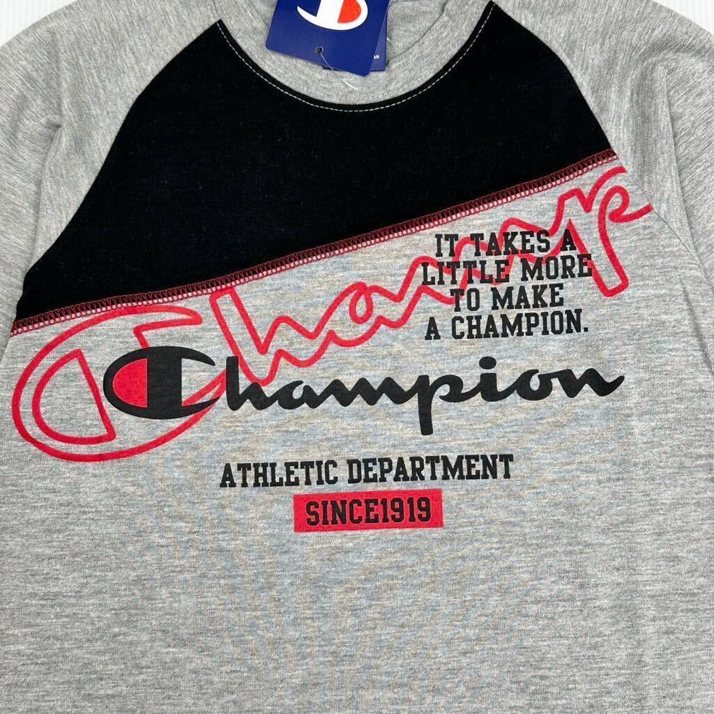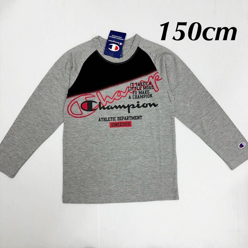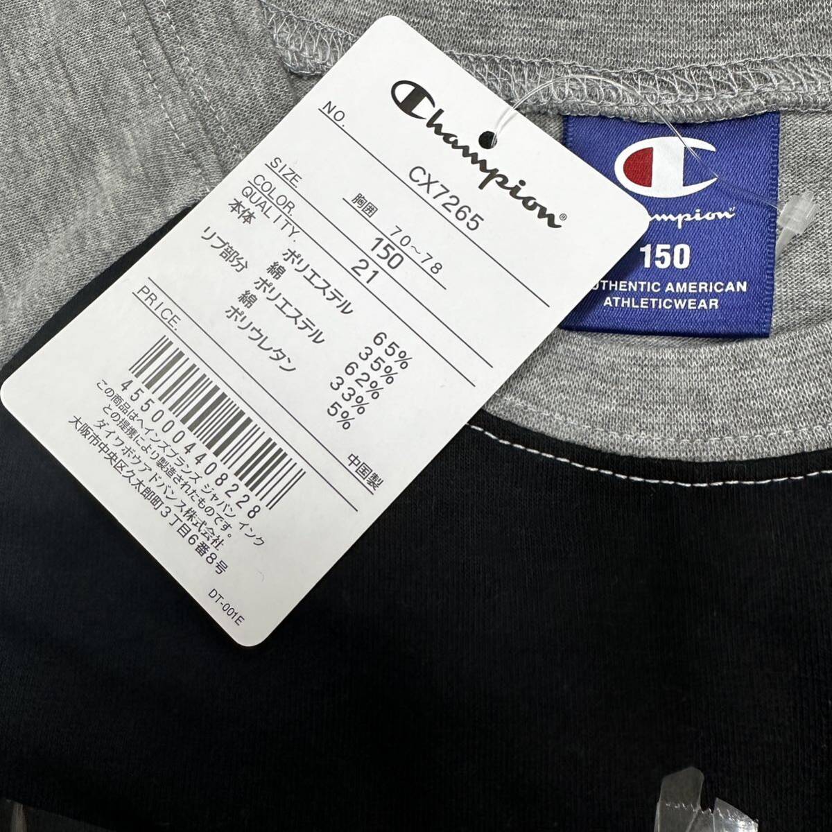 新品18649 Championチャンピオン150cm グレーブラック配色 長袖Tシャツ 胸プリントロゴ丸首Tシャツ オールシーズンキッズ ジュニア ロンT