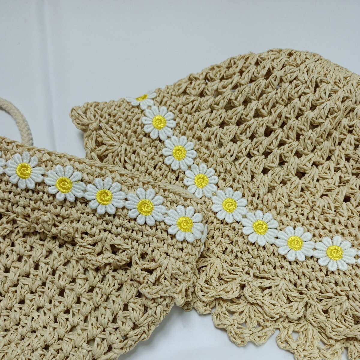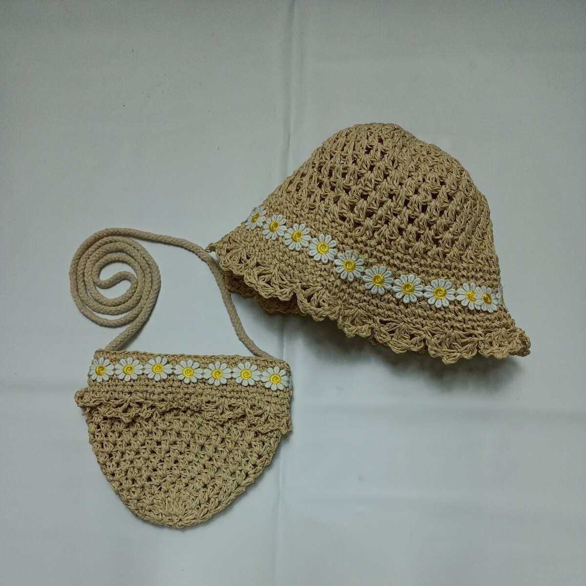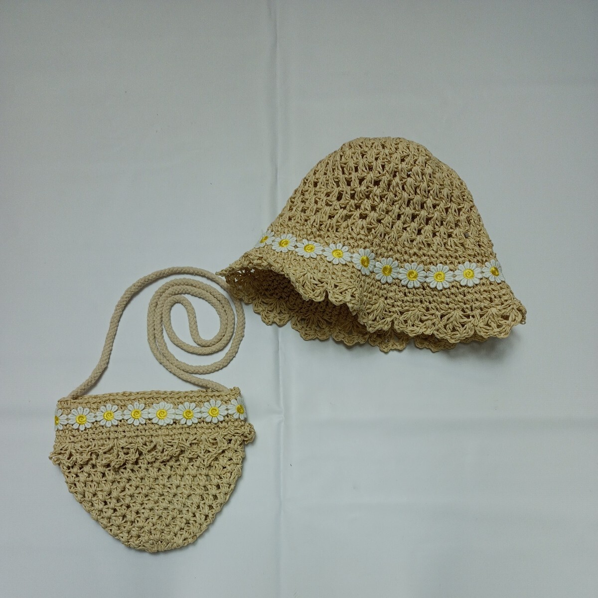【未使用】 ベビー 赤ちゃん 女の子 帽子 草編み帽子 麦わら帽子 ショルダー バッグ 花柄 シンプル カジュアル お出かけセット