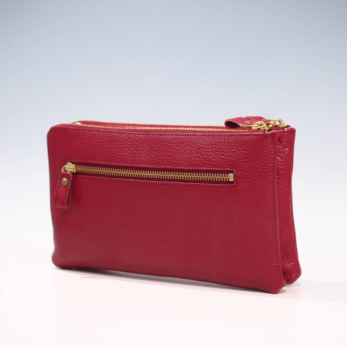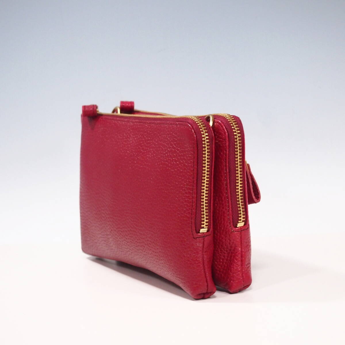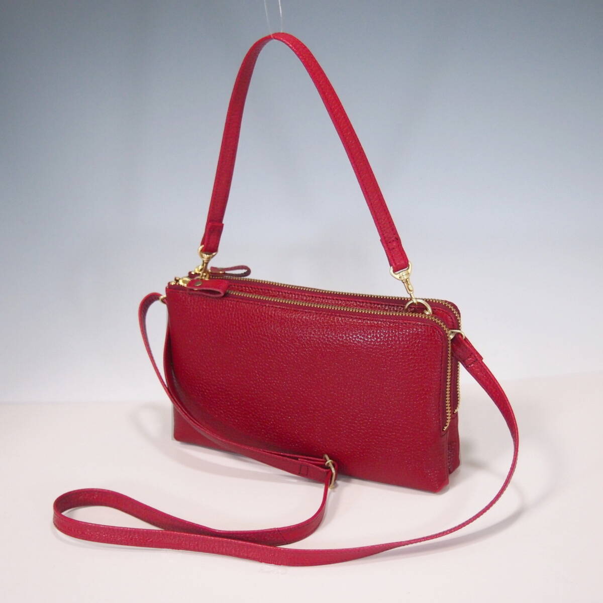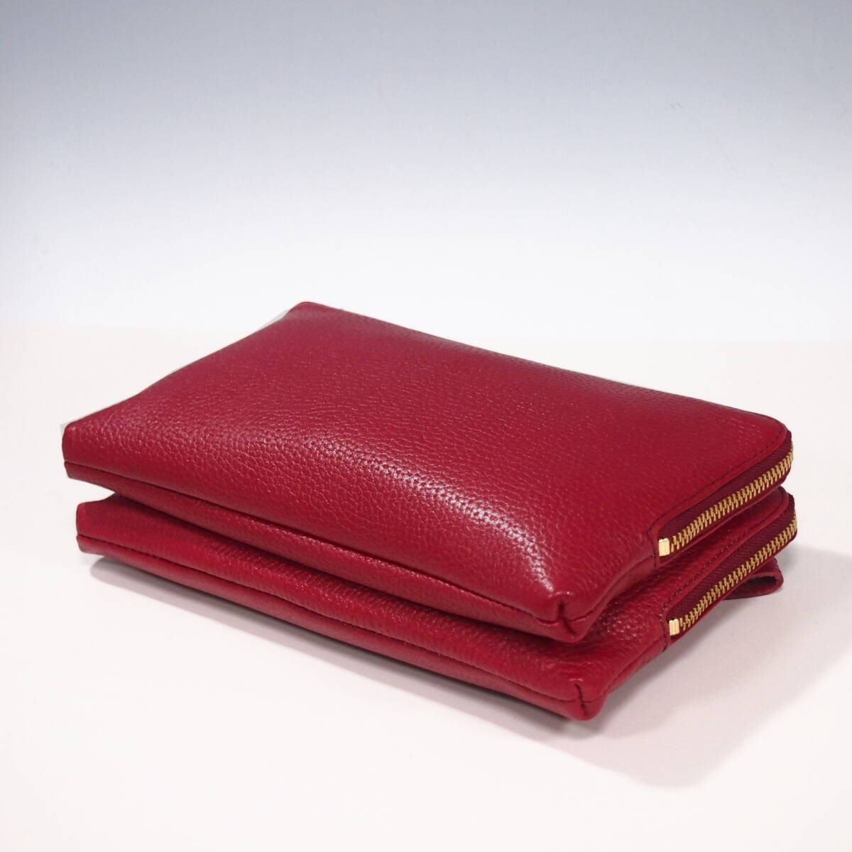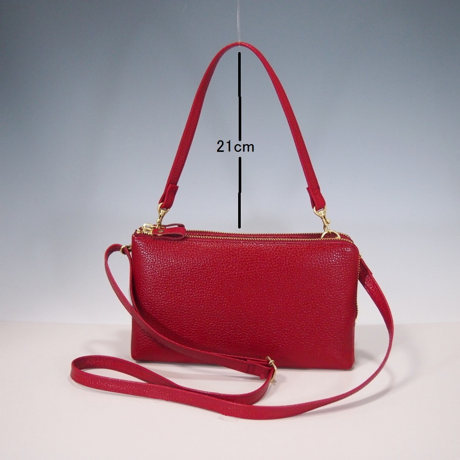 ★新品★ハンドメイド★日本製★ソフト牛革★お財布ポシェット★ダブルファスナー★ハンドル付き(取り外し可)★ショルダーバッグ★アカ色