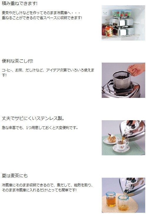 材質: 本体:ステンレス(底の厚さ0.6mm) 蓋:ステンレス 蓋つまみ・取手:耐熱フエノール樹脂 ストレーナー:ステンレス 満水容量:2.8L 適正容量:2.5L以内 取っ手を立てた状態の高さ:135mm