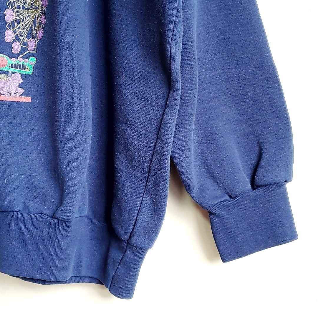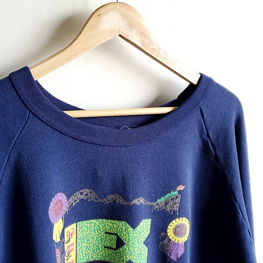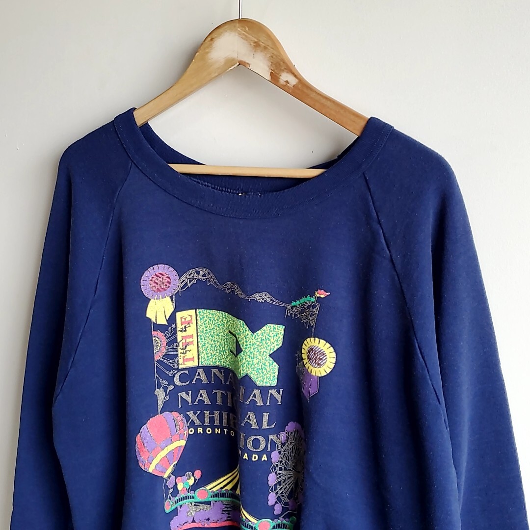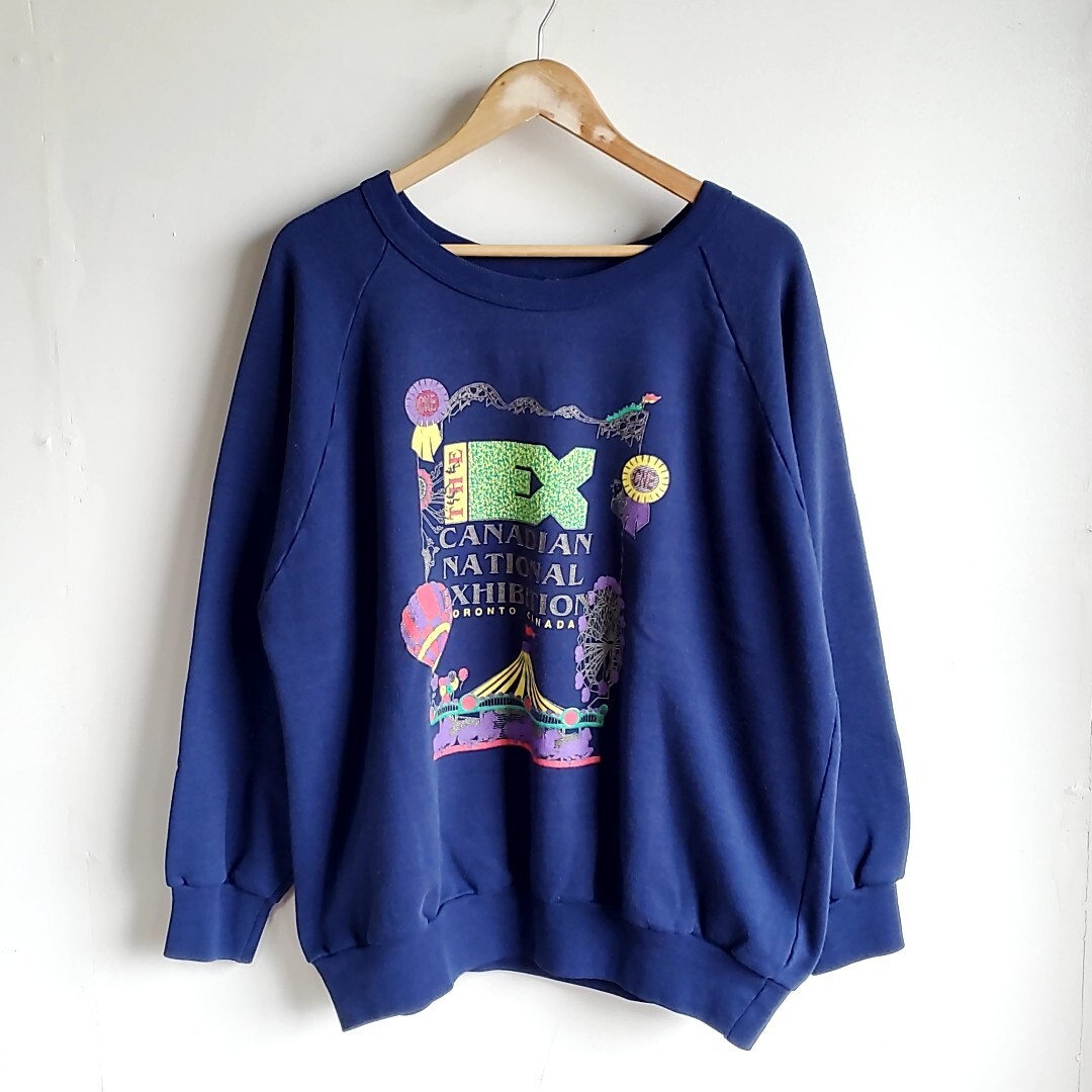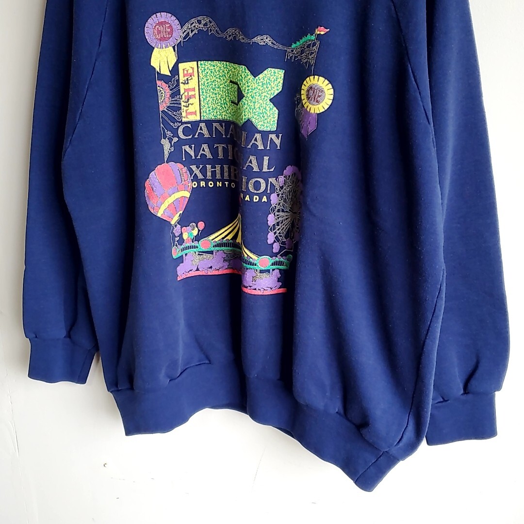 73◆カナダ製 canadian national exhibition ラグラン袖 スウェット トレーナー sizeXL 青 ブルー 遊園地 プリント 古着 USED 中古
