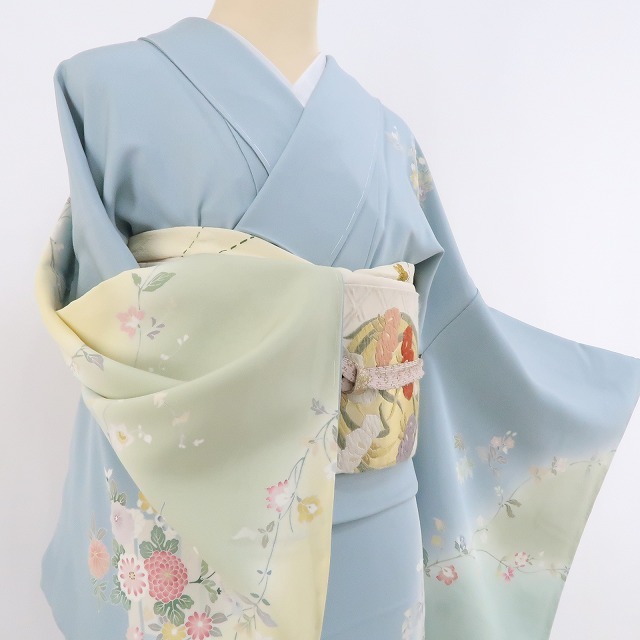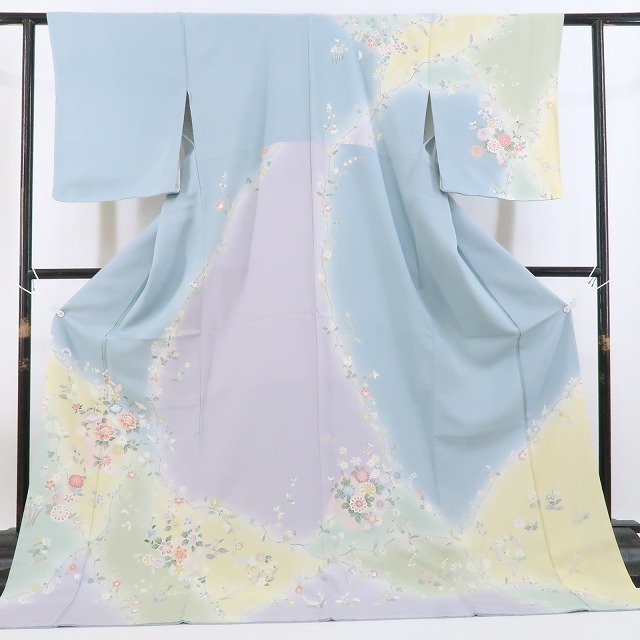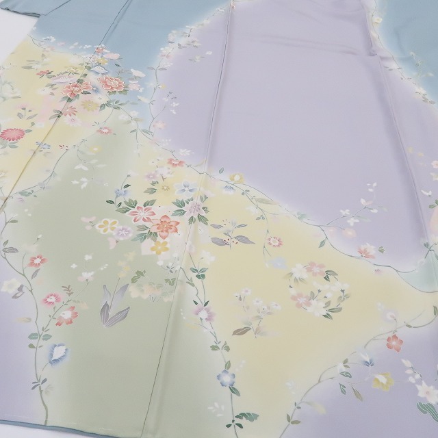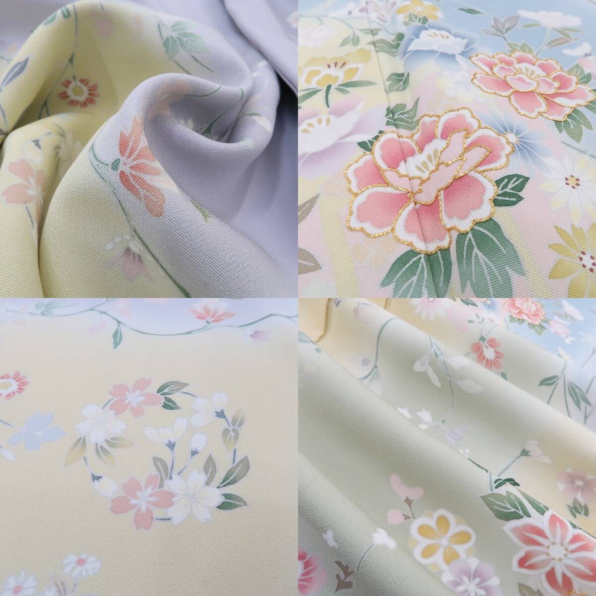 こちらのお着物は、柔らかなトーンの彩色に季節を意識した美しい花景を込めております。金駒刺繍の煌きなれども決して過飾にならず、手描き友禅ならではの丁寧な柄付けが印象的に際立つお召し物です。