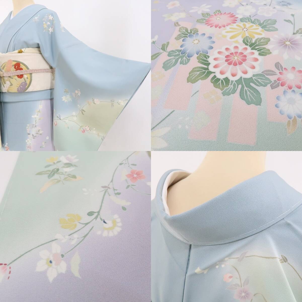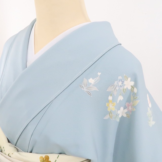 趣ある薄縹色の温もりに愛らしい表情で描き込まれた優の花々、和みを届ける花小柄の数々が創り出すえも言われぬ心地よさ、そして金駒刺繍の模りが添える極上の艶、正に“幸多かれと新しき季節を迎える”、お洒落をこよなく愛する貴女へぜひ。