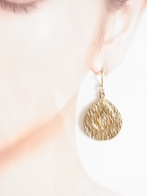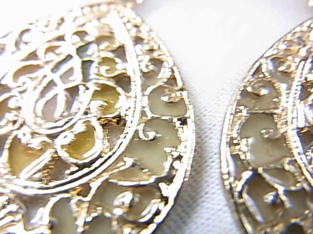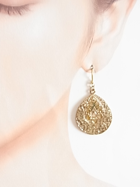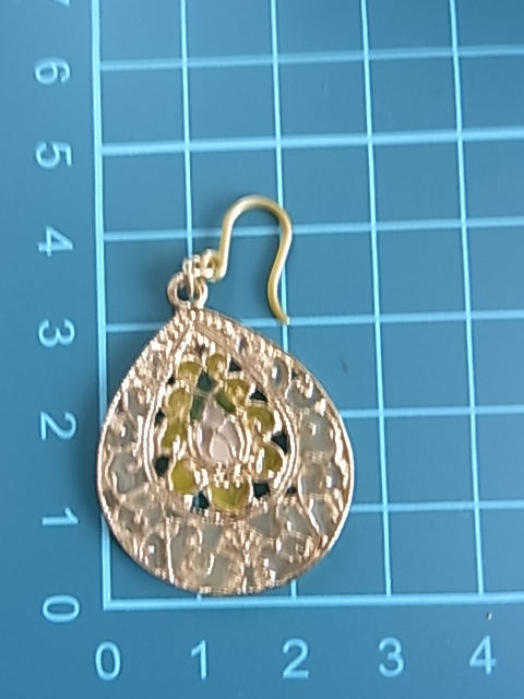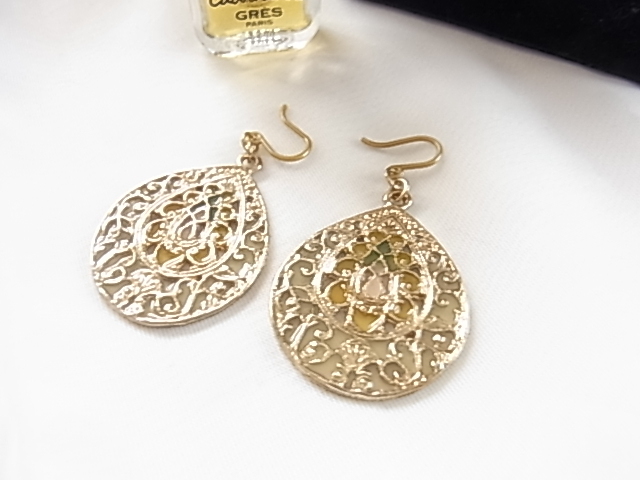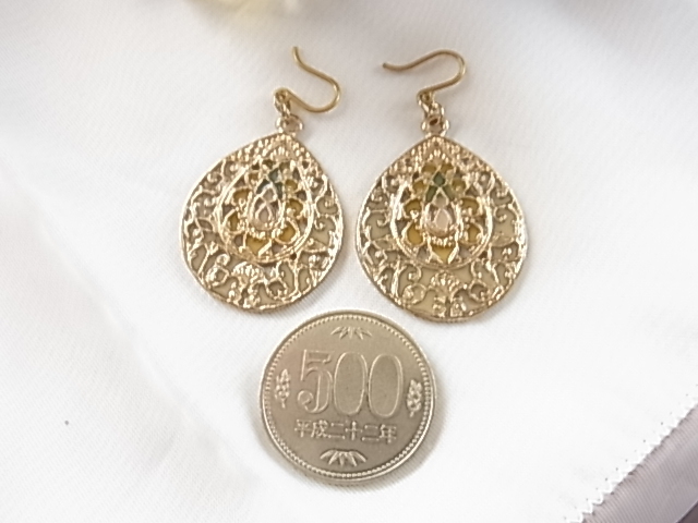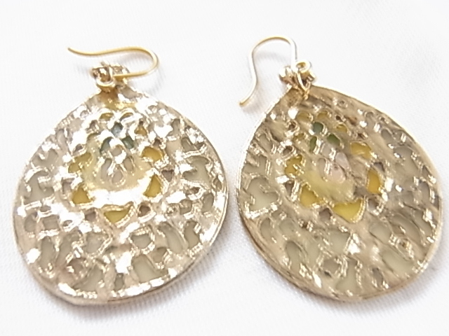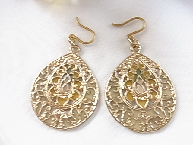 アジアンテイスト 金色 ゴールドトーンの透かし模様のデザイン 雫形 ディアドロップ 生壁色とオリーヴドラブ色のエナメル装飾ピアス▽