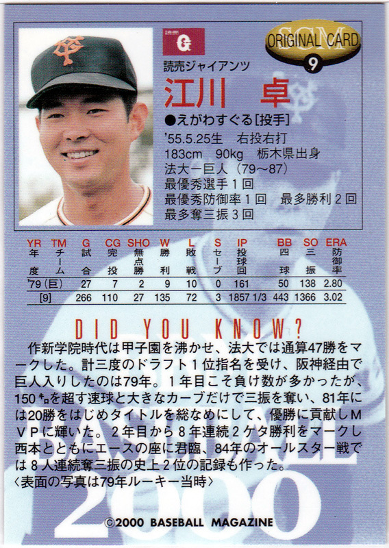 BBM 2000年 スポーツカードマガジン付録 SCMオリジナルカード No.9 江川卓(巨人/読売ジャイアンツ) 野球カード