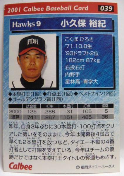 カルビープロ野球カード2001年#039【小久保 裕紀(福岡ダイエー ホークス】平成13年チップスおまけ食玩トレーディングカード【中古】送料込