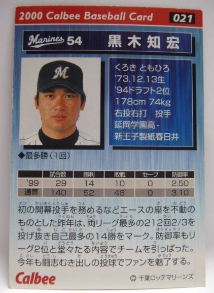 カルビープロ野球カード2000年#021【黒木 知宏(千葉ロッテ マリーンズ)】平成12年チップスおまけ食玩トレーディングカード【中古】送料込