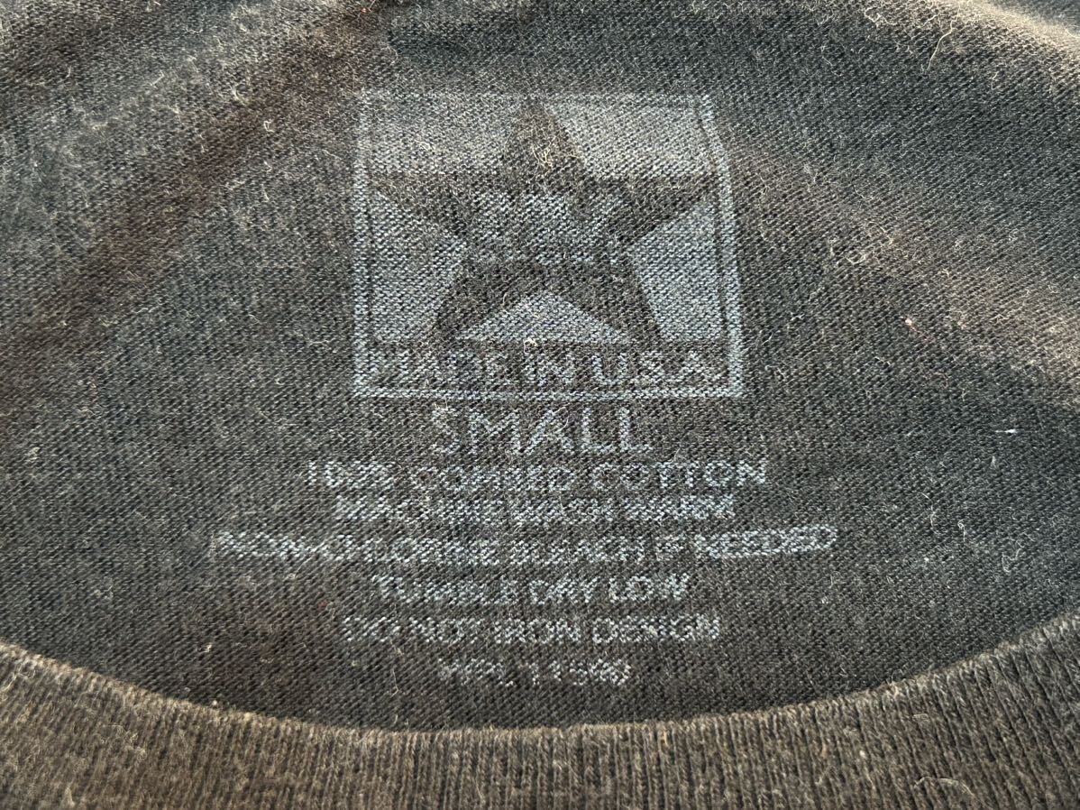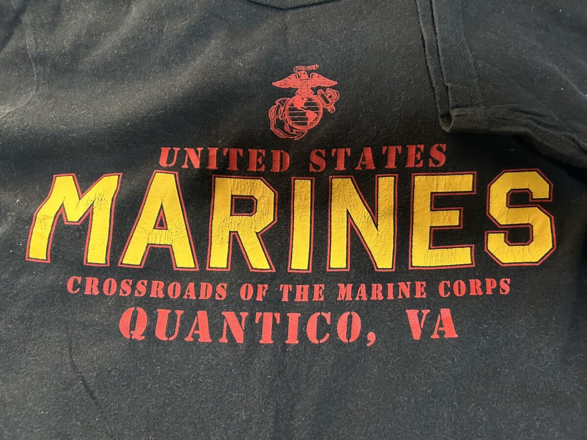 アメリカ製、UNITED STATES MARINES、米海兵隊のロゴマーク入りTシャツです。コットン100%、カラーはブラック、サイズはアメリカS表記、実寸は肩幅約40センチ、身幅約47.5センチ、着丈約63.5センチ、袖丈約19.5センチです。色褪せ、相応の使用感はありますが目立つダメージはなく、古着にご理解あれば、着用の支障はないと思います。アンカー&グローブ、ヴァージニア州、クアンティコ基地のプリントのカッコいい5段プリントです。ラバープリントの割れが見られますが、雰囲気程度なので、醜い程度ではないと思いますが、少しでも気になる方は入札をお控え下さい。