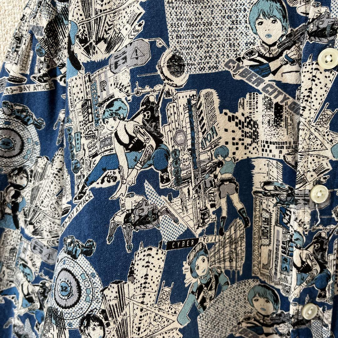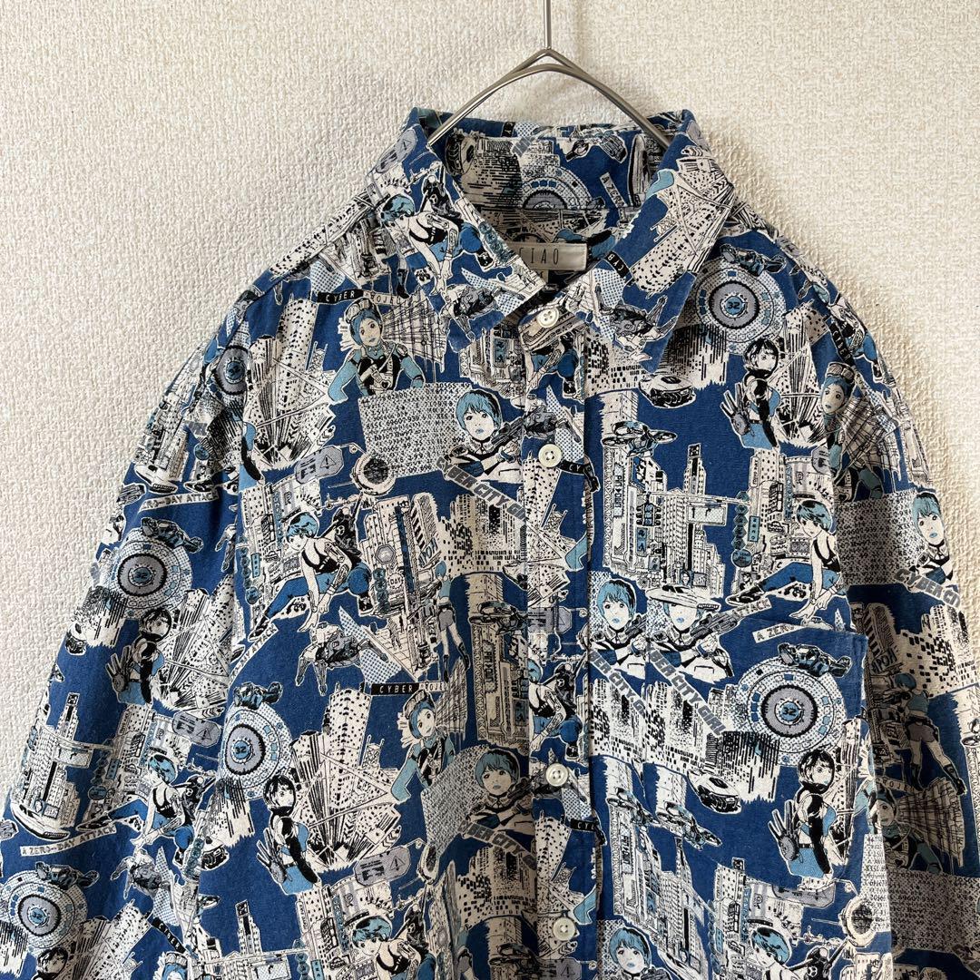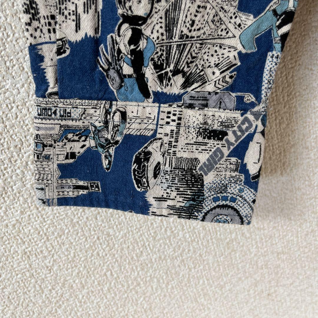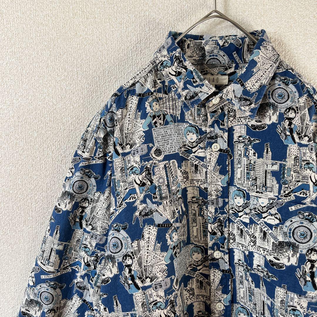 Q3パターン柄シャツ サイバーキャラ 長袖 麻素材 リネンシャツ Mメンズ
