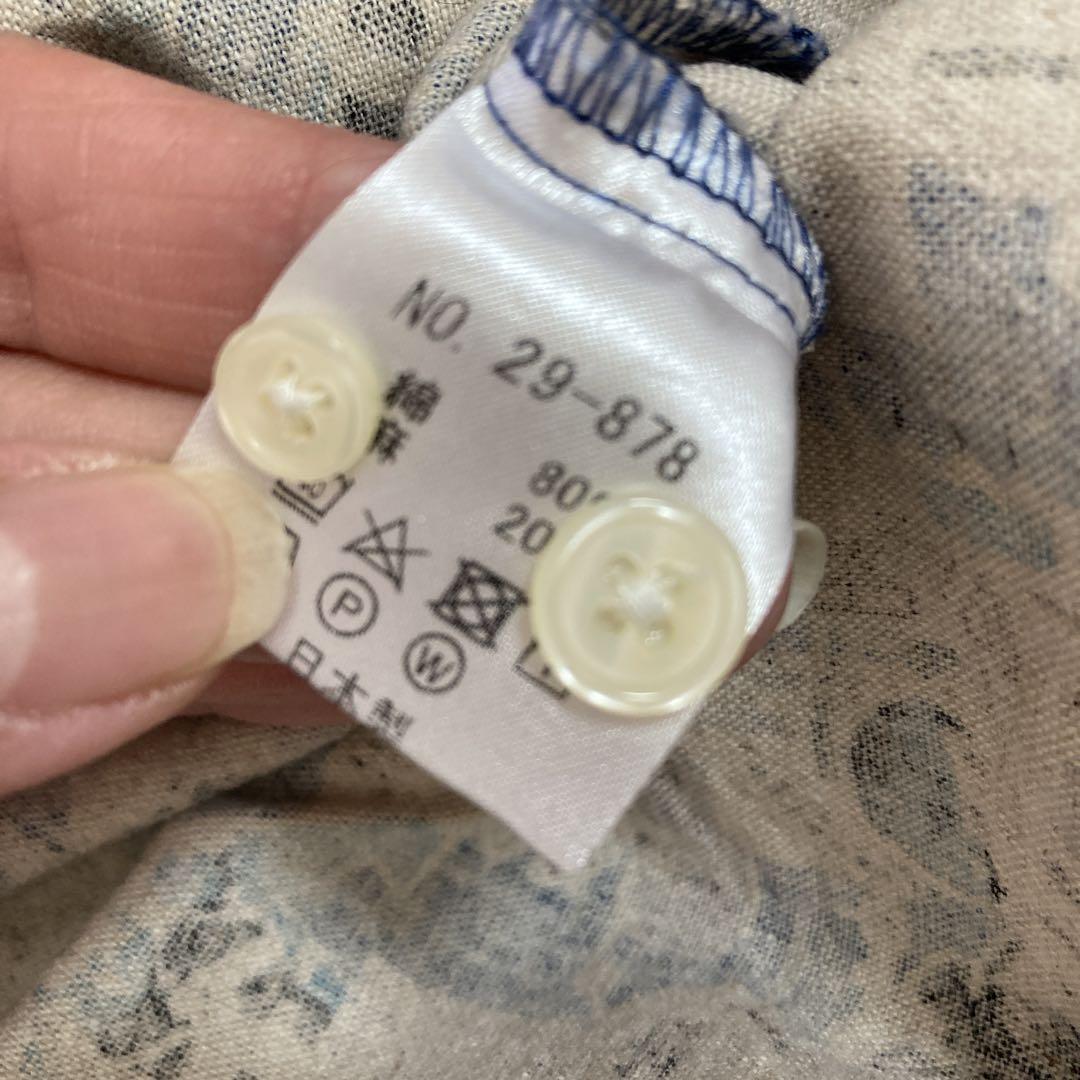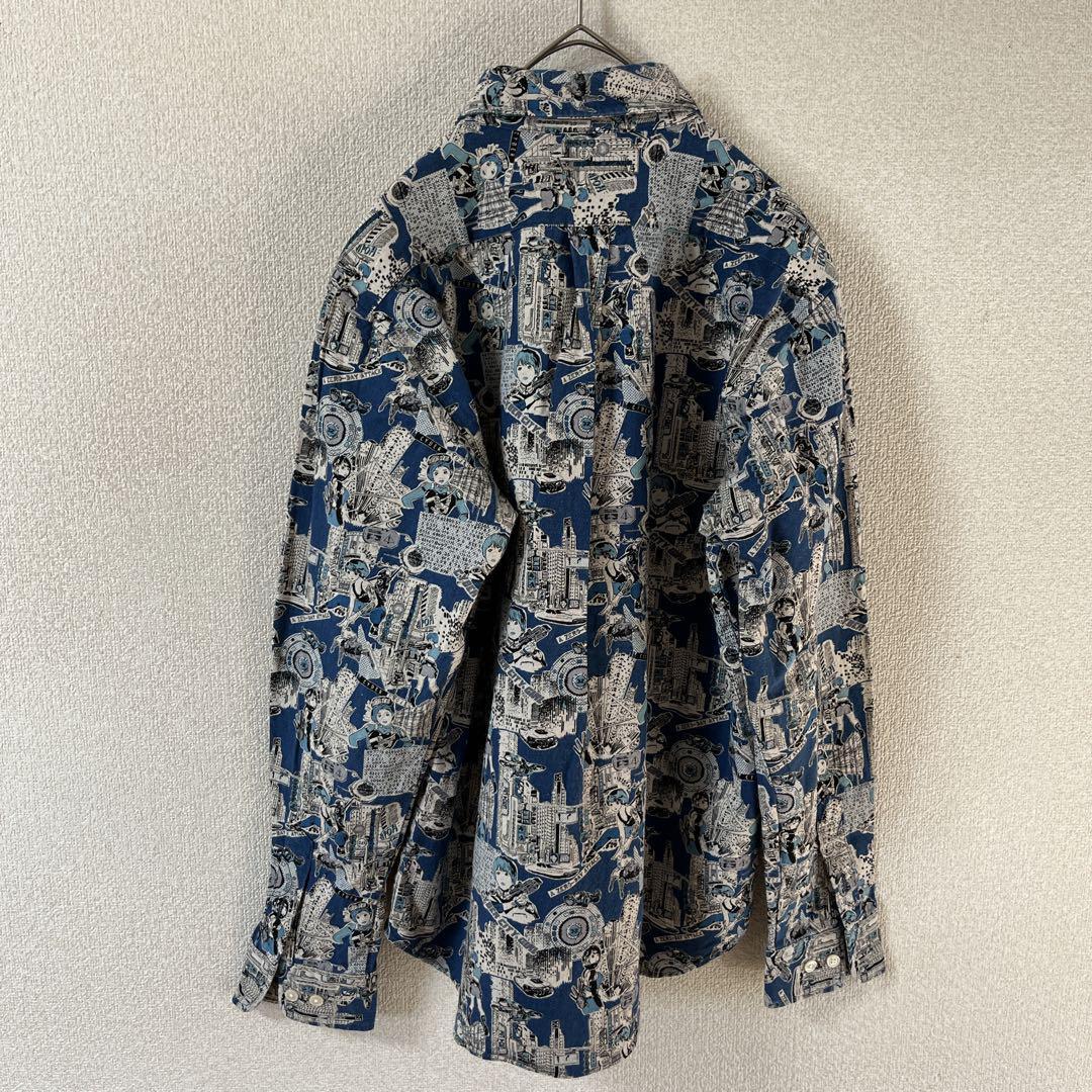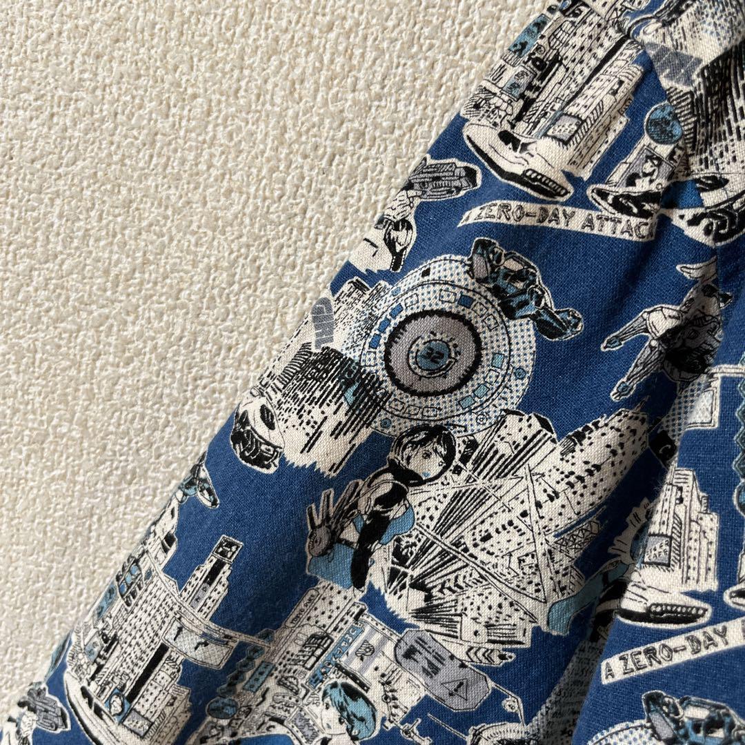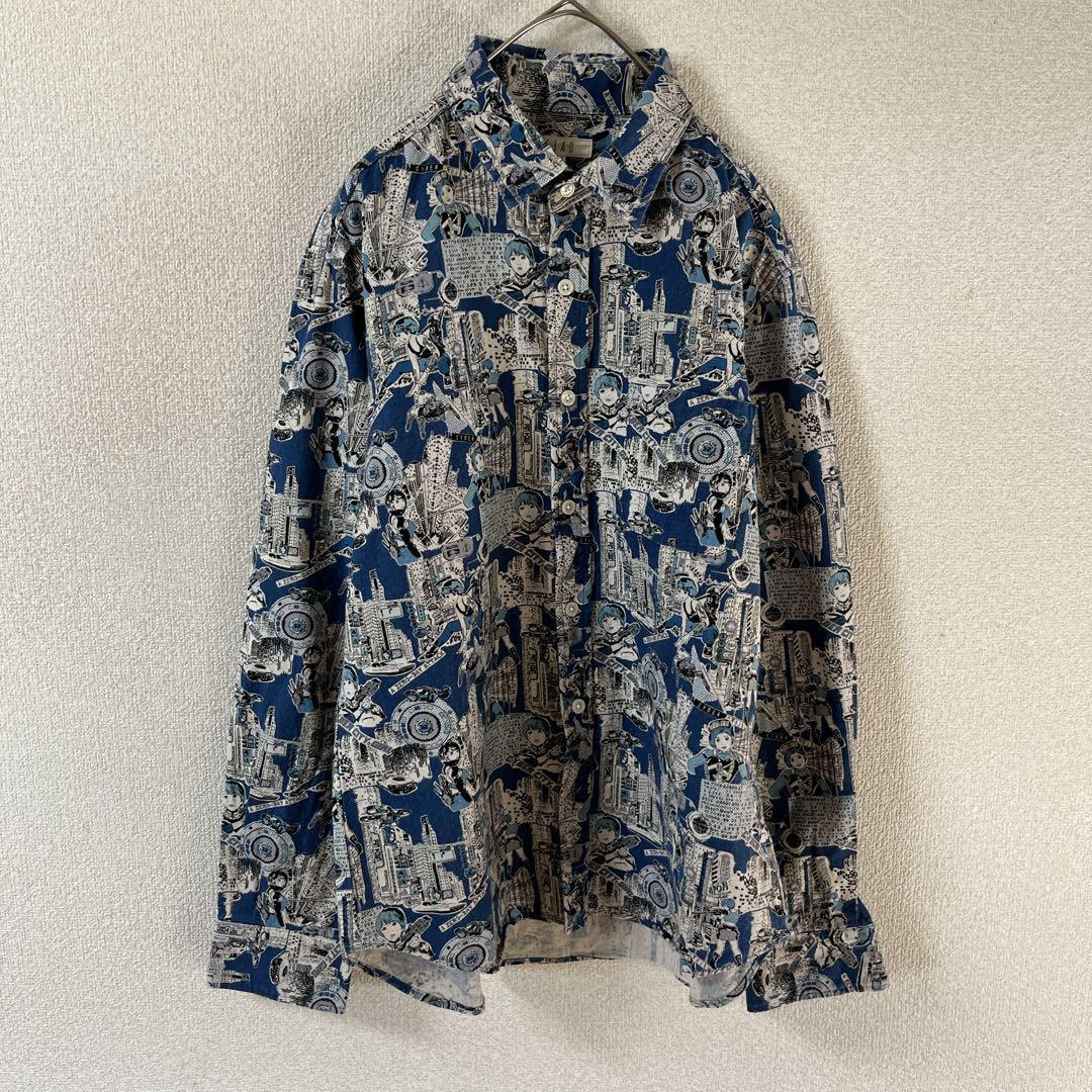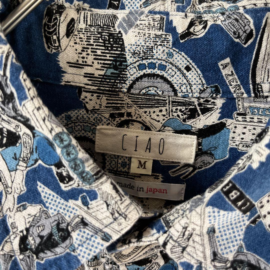 Q3パターン柄シャツ サイバーキャラ 長袖 麻素材 リネンシャツ Mメンズ