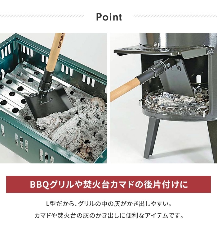 L型だからグリルの中の灰がかき出しやすい。 カマドや焚き火台の灰のかき出しに。 スコップと灰かき、使い方二通り。 |