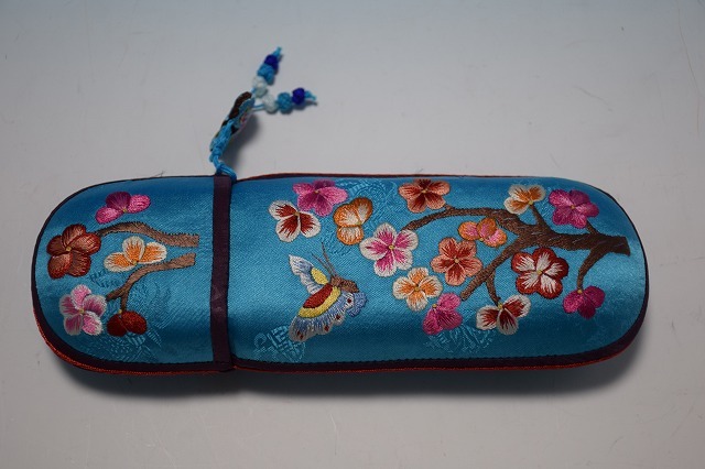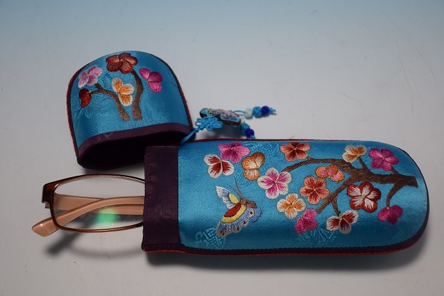 筒形の本体に可愛い花柄の刺繍が両面に入った贅沢なメガネケースです。
