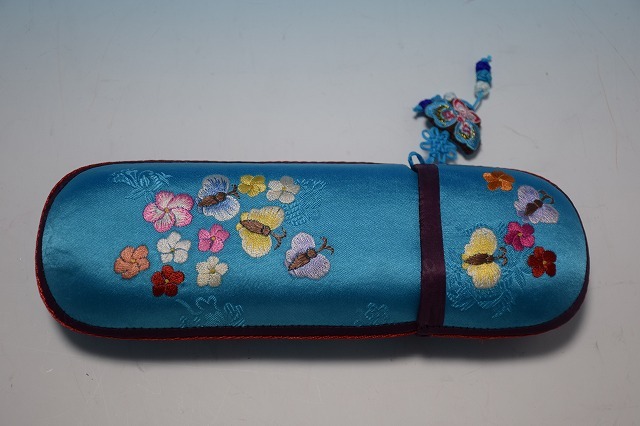 ◆韓国雑貨◆刺繍入り筒形メガネケース◆ターコイズブルー◆送料無料◆